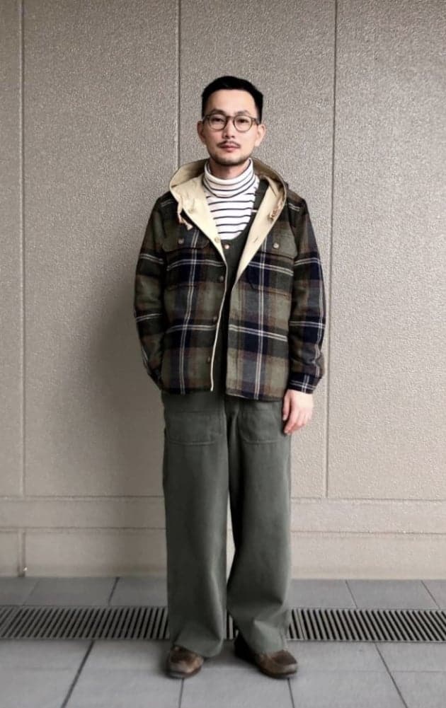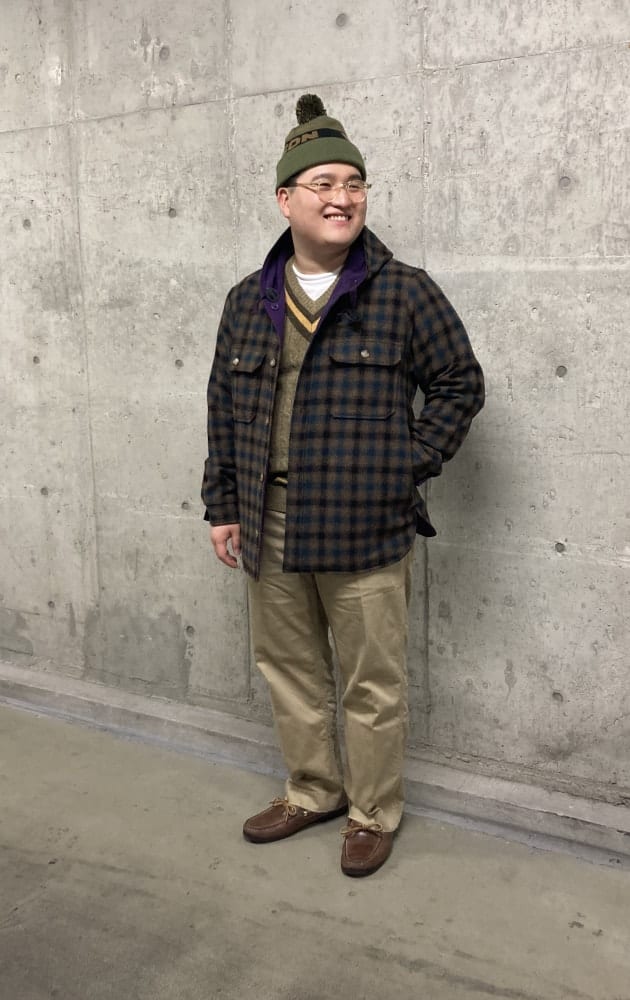 以前見たことがある、オーバーサイズのネルシャツをボタンダウンにチノパンというごく普通の組合せの上から羽織っていたアメリカの学生の写真を思い出してこのスタイリングに。