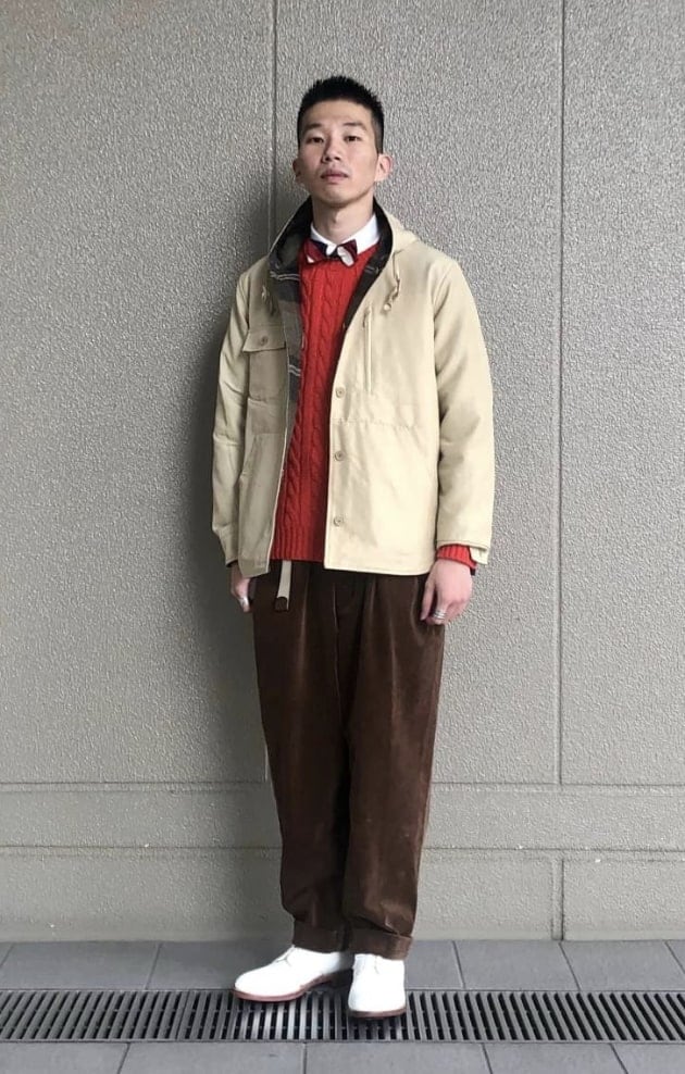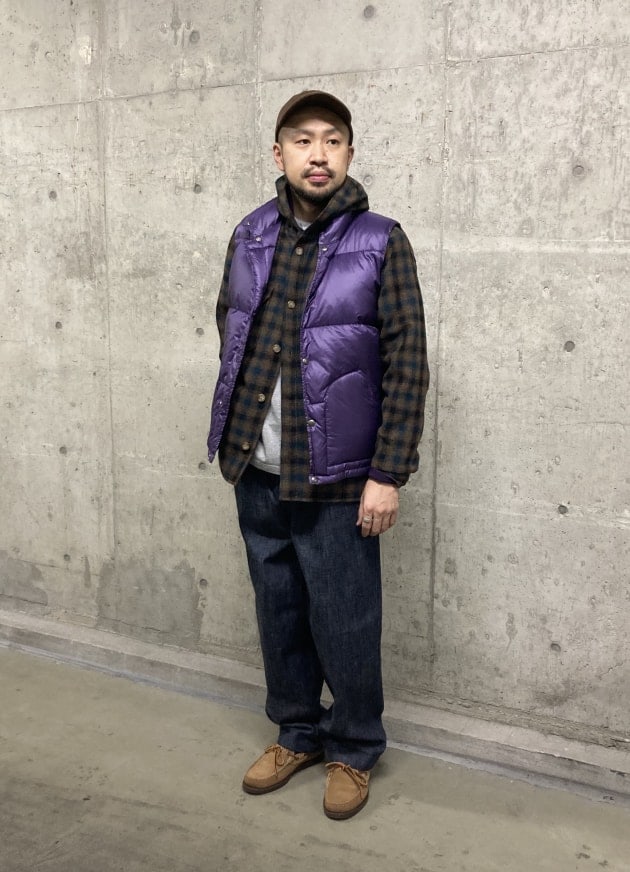 桑田はアウターとしてパーカーの上に着用。ジャズネップの表情に加工の入った同ブランドのスウェットパーカーに色の落ちたブルーデニムのGOODバランス。このようにスウェットなどを中に挟めるサイズフィッティングになっているためこれからの季節の羽織りとしてはもってこい。ポケットが付いているのも嬉しいポイントです。