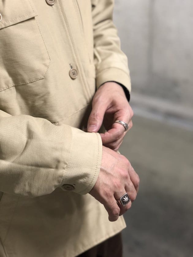 “C.P.Oシャツ”というモデル名もU.S.NAVYなどミリタリーウェアとしてはもうお馴染みですが、先程お話ししたジャズネップのソフトな生地感に加えてややゆとりのあるサイズフィッティング、腰にはポケットを配置することでよりアウターとしての使い方がメインになってくるかなと。