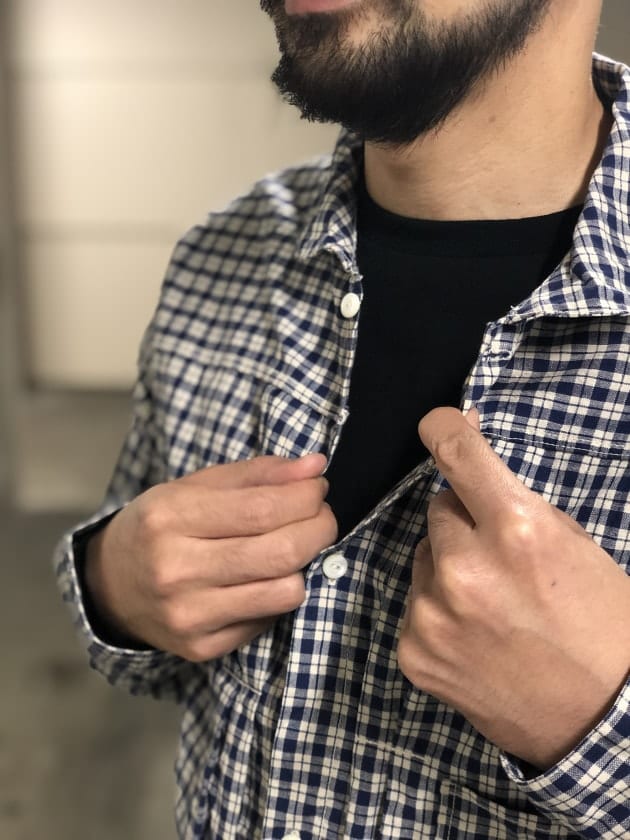 同色のステッチ、カンヌキ、フロント3パッチポケット&左胸裏にもポケットつき。
