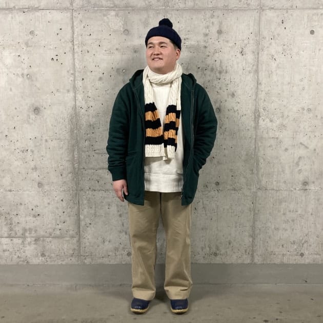 クリスマスを意識しているであろうグリーンのスウェットに、合わせたマフラーの相性は抜群にいいですね。