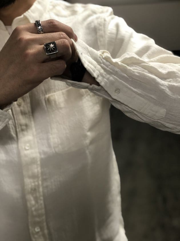 肌触りの良さ+袖まくりした時に、アクセントにもできますね。