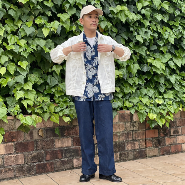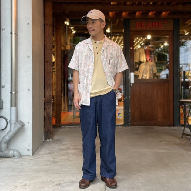 柄の主張があるシャツに対し、崩し過ぎない様にウールトロピカルのグレートラウザーズでコーディネート。