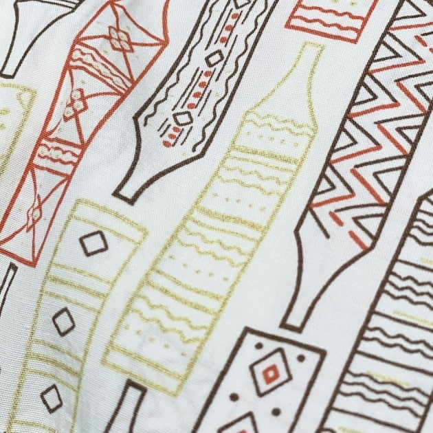 抜染プリントは名前の通り、インディゴの下地の色を抜いて柄を表現する技法。