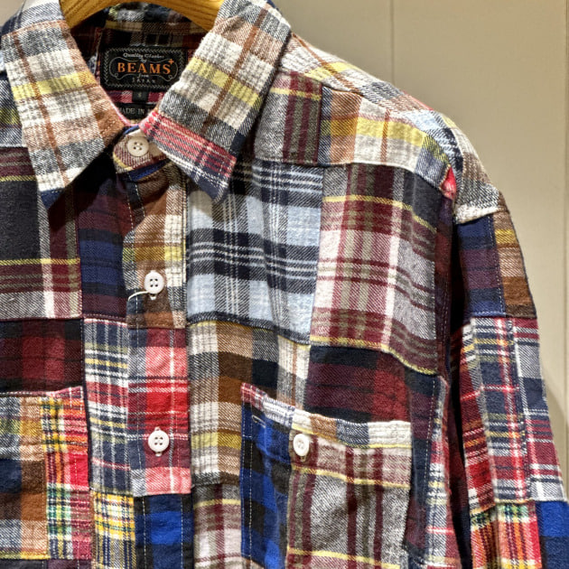 ワークシャツと言うと、無地のシャンブレーやデニム、コットンツイル、はたまた柄ならチェックやストライプが定番?ですが、こちらは見ての通りのチェック柄のパッチワーク仕様。
