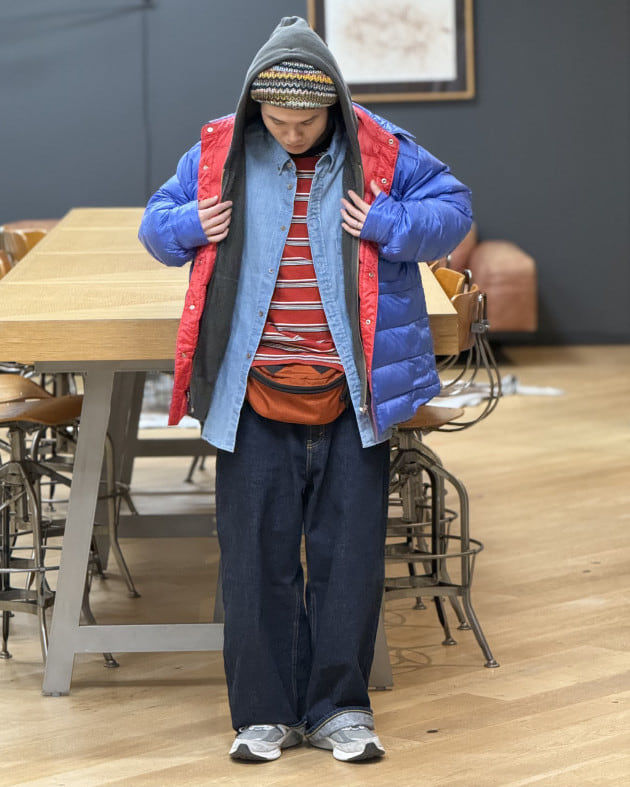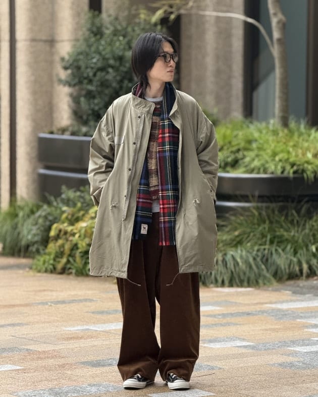 ローテクなスニーカーと合わせていますが、まだ寒い時期が続く2.3月はロングソックスを巻き込ませ、ハイカットやブーツなど厚みのあるシューズと合わせるスタイルも◎