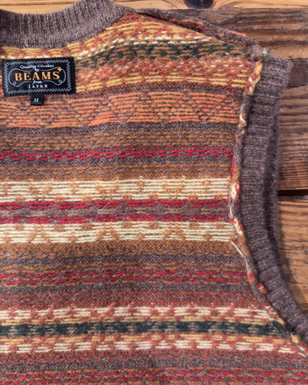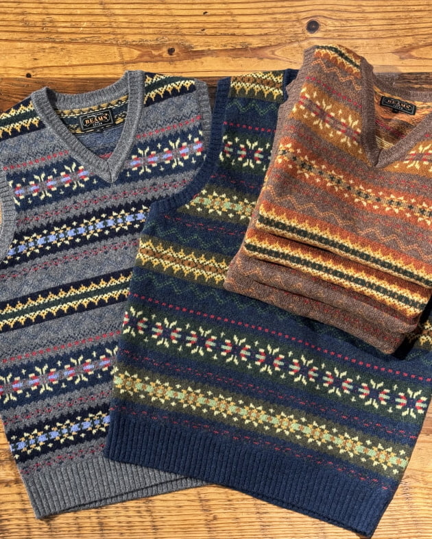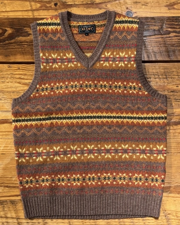 先週の要チェックに引き続きニット系のアイテム、フェアアイル柄を横に伸ばしたようなデザインのカーディガンでしたが、今回は直球どストレートなフェアアイル柄のニットベストになります。