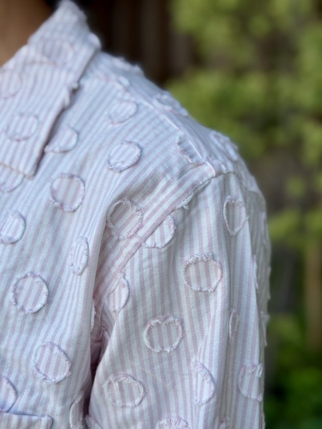 もう一つの特徴であるストライプ柄もそれぞれの配色のバランスを考え、ポケット部分の柄合わせもしているのでシンプルながら存在感のある1枚に仕上がっており、夏に1枚で着ていただくにもとても良いと思います。