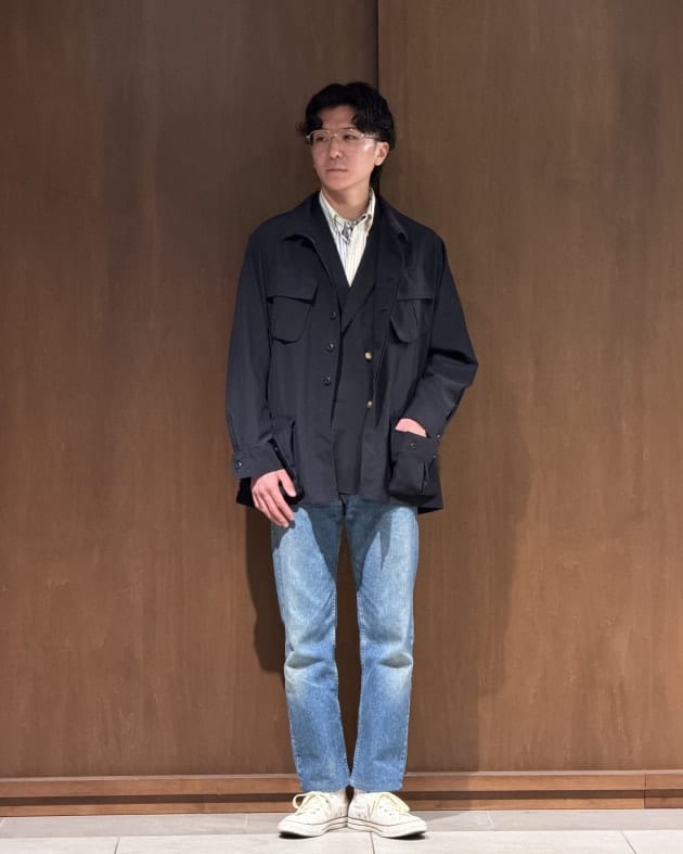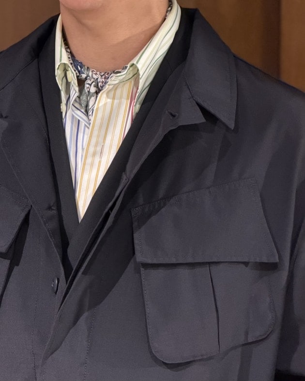 ウールを生地に使うことで生まれる、しなやかさや滑らかさ・ドレープ感と表現されることが多いですがまさにその通り、パキッとした光沢感というよりは少し鈍い光り方をしているので、ジャングルファティーグジャケットとのギャップがつきすぎていない点がただ斬新な素材使いをしているのではなく、細部にまで考えられた提案であると感じます。