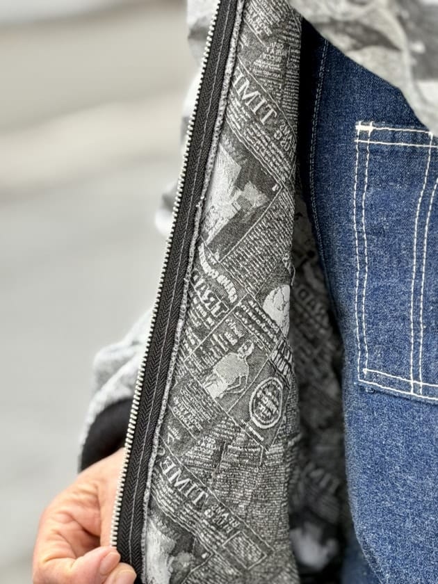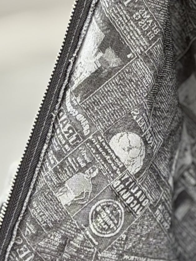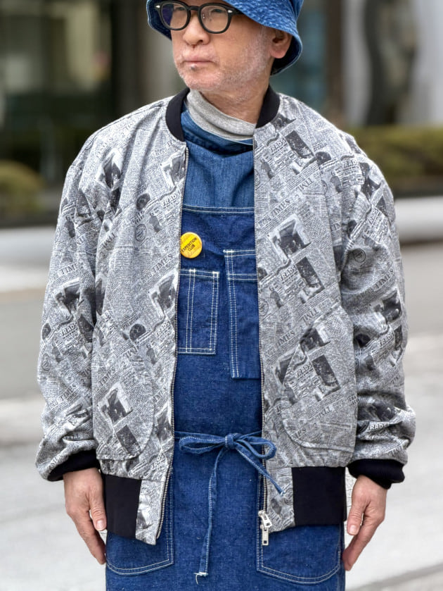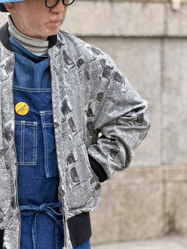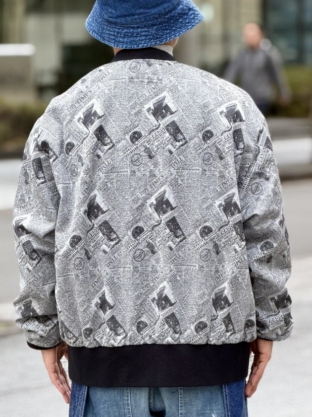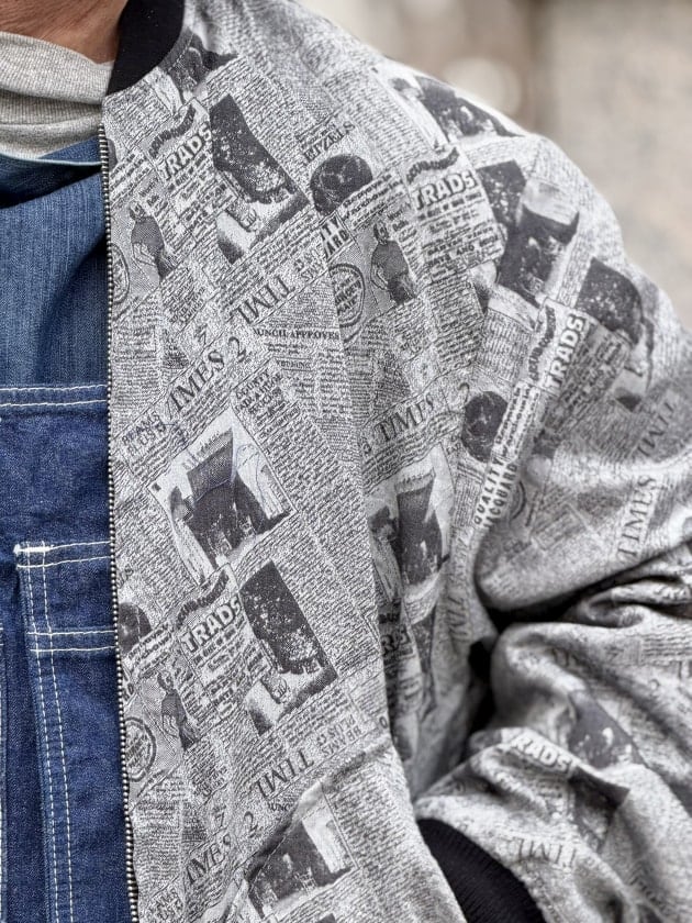 ヴィンテージウェアに見られるニュースペーパープリントのジャケットを着想源に、そのモチーフを“プリント”ではなく“織り柄”へとアップデートした1着です。