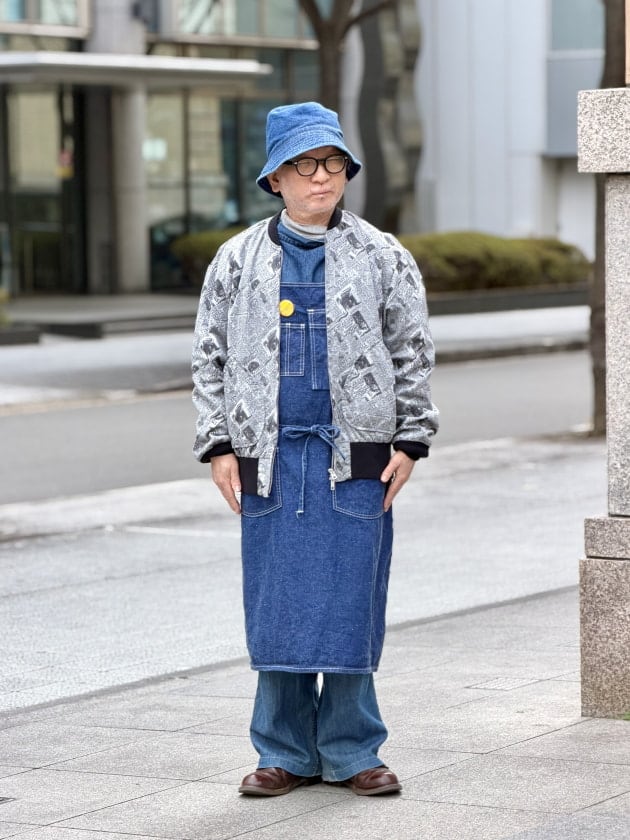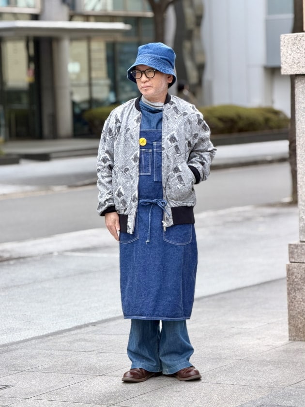 身長158センチの私は通常はSサイズですが、こちらはMサイズ。細長効果を狙ってデニムエプロンですコーディネートしてみました。