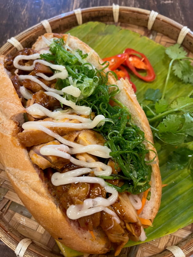 踊り疲れたら退散して、近隣の店舗でバインミーを食べる若者が多く見受けられました。