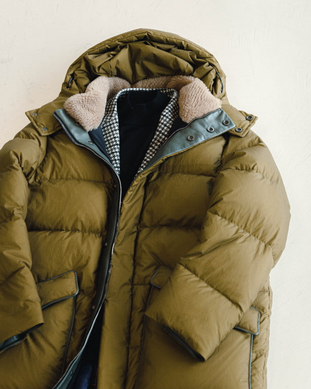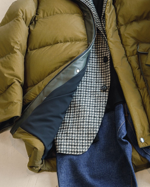 インナーに着ているタートルネックは<GRAN SASSO>の定番である12ゲージメリノウールタートルネックです。<CIRCOLO1901>のハウンドトゥースのパープルを拾って色を合わせました。