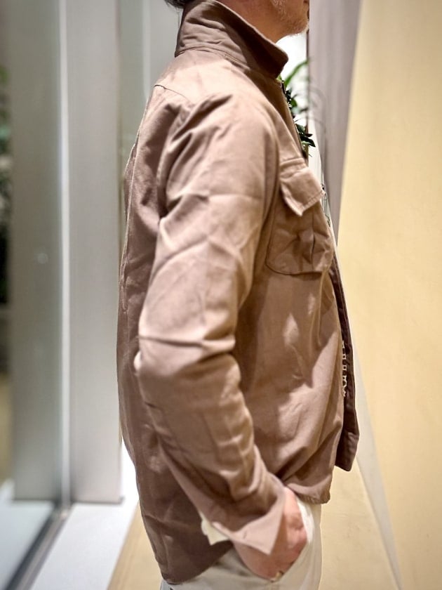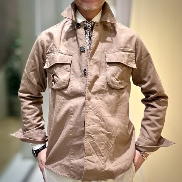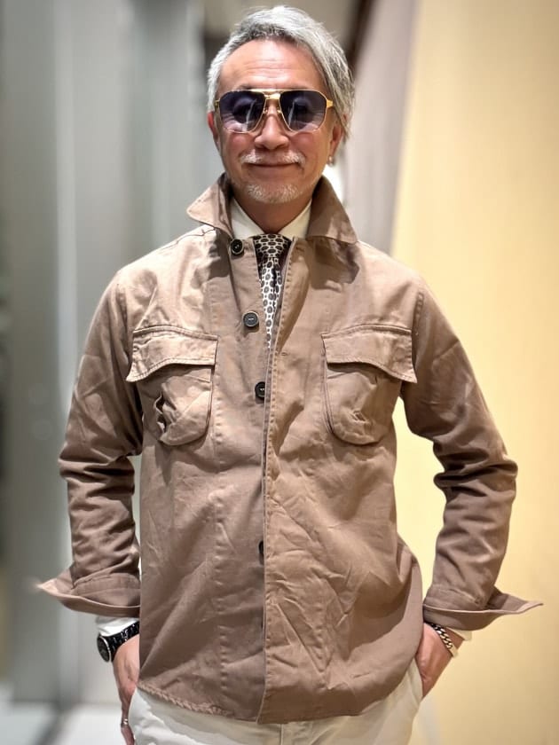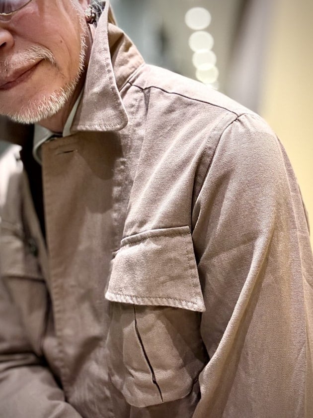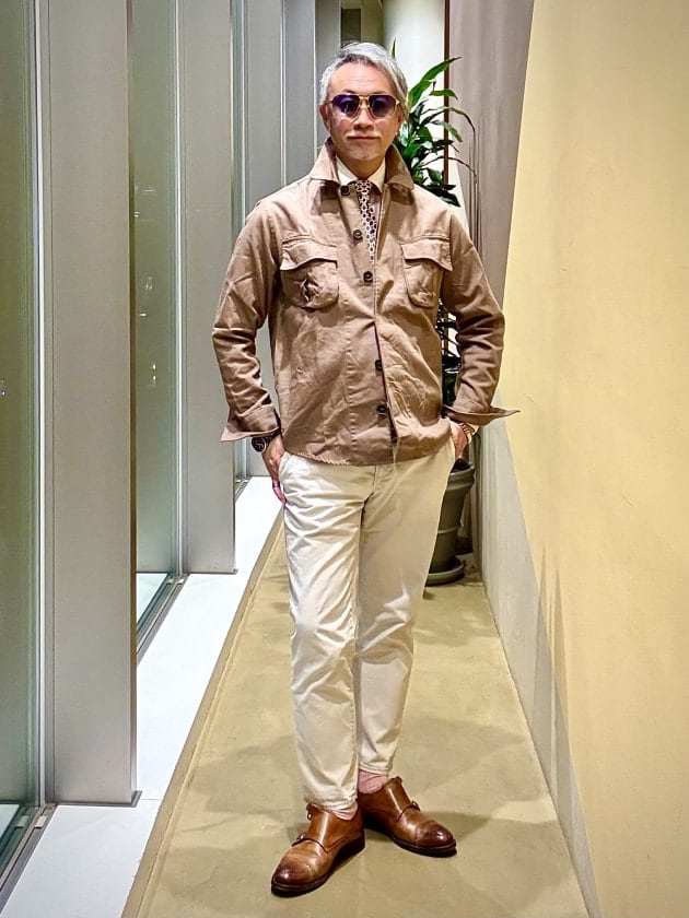 シャツはこちらイタリアナポリのシャツメーカー<MARIA SANTANGELO>のピンストライプです。<MARIA SANTANGELO>はシャツ工場というよりは工房といった小さな規模で、現在でも職人がハンドメイドの工程を使って1枚づつ丁寧に作られているシャツ工房です。襟の羽根が少し閉じたセミワイドカラーがとてもカッコいいですね。この襟型はビームスの別注です。