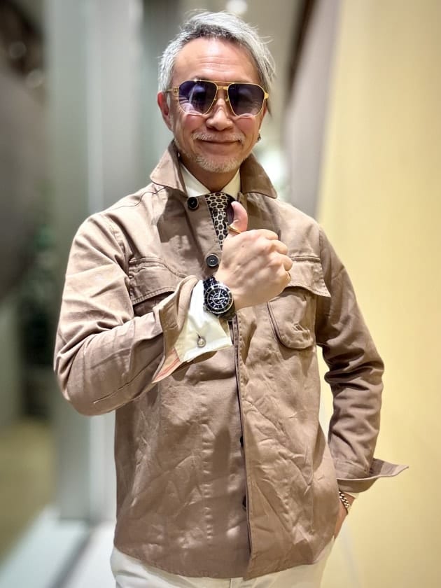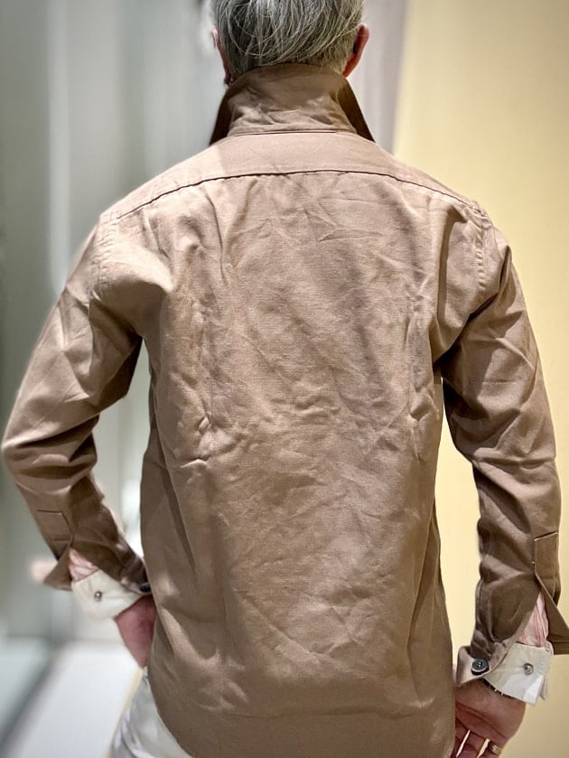 シャツは<GUY ROVER>のロンドンストライプシャツです。白とベージュのコンビネーションなのでそこまで派手には見えないと思います。このシャツは<GUY ROVER>が長年展開している小ぶりのワイドカラーにしています。ネイビースーツだけでなくグレー系やブラウン系にもとても相性が良い色だと思います。ベージュ系のコットンスーツなどにもおすすめのシャツです。