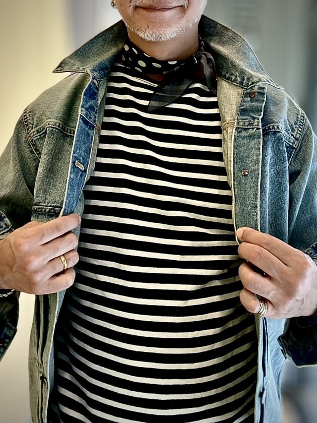 「ジーンズの難点である、腰まわりのフィッティングに拘り、ミミを用いながらも綺麗に収まる型紙作りに注力し完成した一本です。ドレススタイルにも馴染む綺麗なシルエットを見せてくれながら、XXらしいワイルドさを持った、絶妙な仕上がり。これまで展開させていただいていた”PHIL MENPU”とは異なり、裾幅が太くリアルなXXに近いストレートシルエットで表現しています。私が穿いているものも同じデニムで、裾をこのぐらい折り込んでこなしても格好良いと思います」