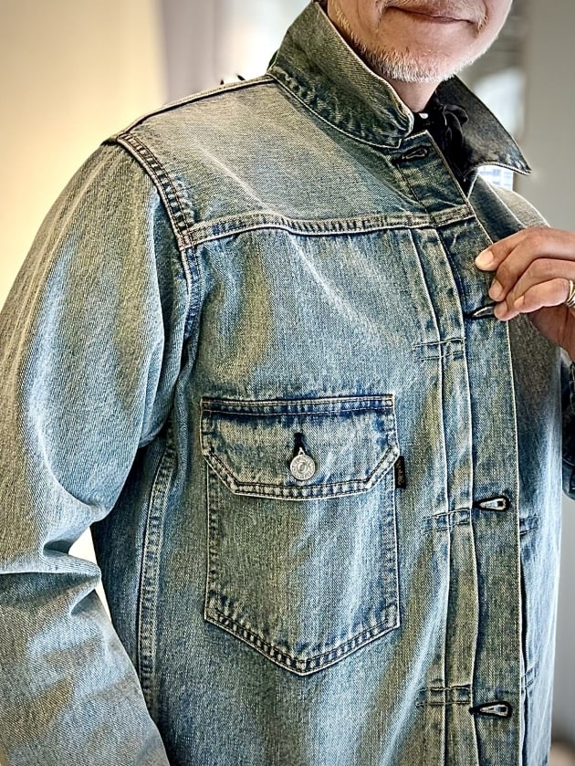 「また、機能的なポケットの無い大戦モデルですので 、古着でセルフカスタムされる事の多い内ポケットをフランス50年代のデットストックリネンのランチョンマットを利用して取り付けております。アメリカヴィンテージながら、ほんのりとフレンチムード薫るモダンなミックス感も取り入れた時代性のある仕上がりです。シーアイランドコットンの上質な素材感をヴィンテージ最高峰のデニムジャケットで味わえる、まさに至高の一着と言えるのではないでしょうか」