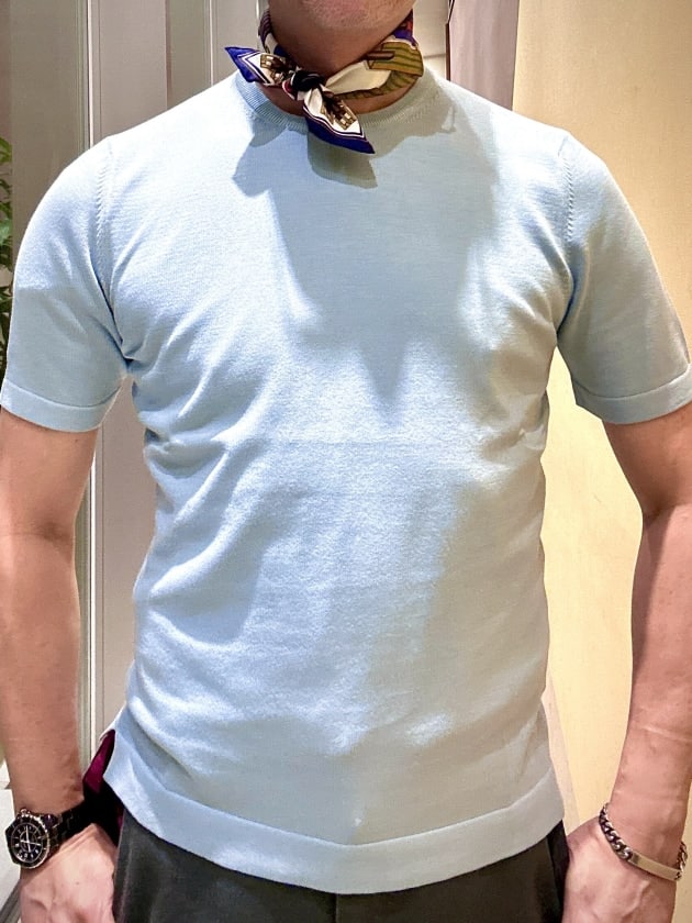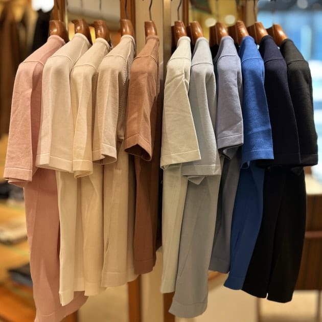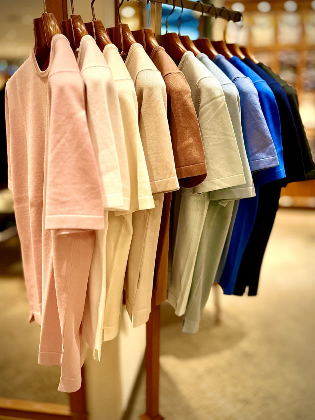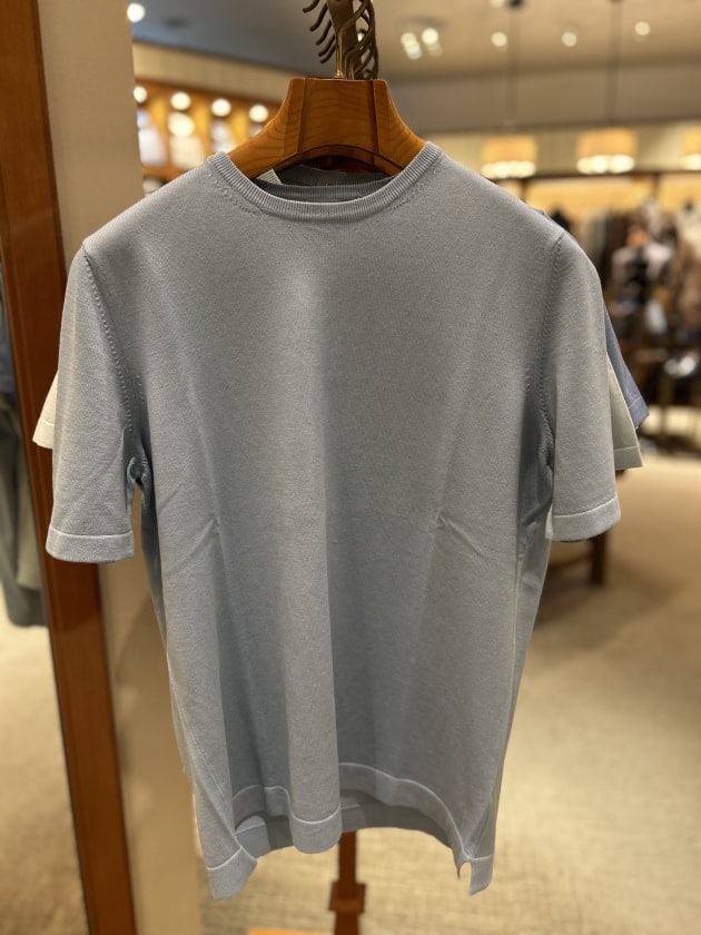こちらは<TAGLIATORE / タリアトーレ>のニットジャケットですね。このジャケットは私もとても気に入っております。ニットなのにとてもきれいなフォルムでさすが「PINO LERARIO / ピーノ・レラリオ氏」のパターンメイキングだと感動したジャケットです。<TAGLIATORE>の「ピーノ・レラリオ氏」は社長でありながらデザイン・パターンメイキング・素材の選定・サンプル縫製といったすべてをこなすマルチプレーヤーなんです。ほんとすごい方です。