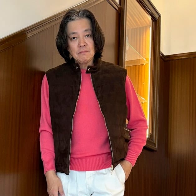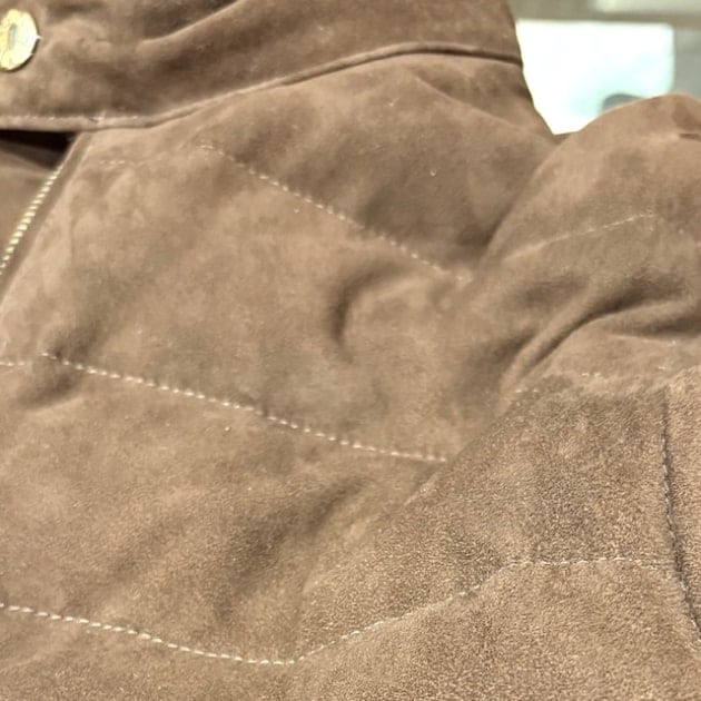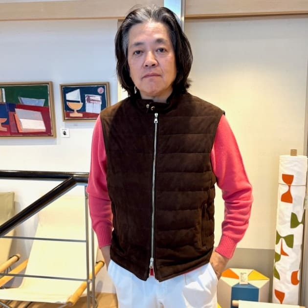 スエードダウンベストは<EMME TI / エンメティ>の「JURI DOWN VEST / ユリ ダウンベスト」です。このダウンベストは<EMME TI>のベストセラーであるライダースジャケット<JURI / ユリ>のデザインが踏襲されており、襟の立ち上がりやドットボタンがとても洗練されたデザインとなっています。さらに通常のダウンベストはボディの横にステッチが入り膨らみますが<EMME TI>は計算されたパターンによって、身体に沿うスリムなフィッテイングを実現しているんです。