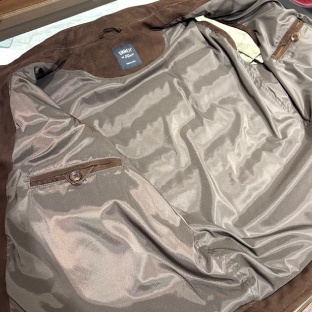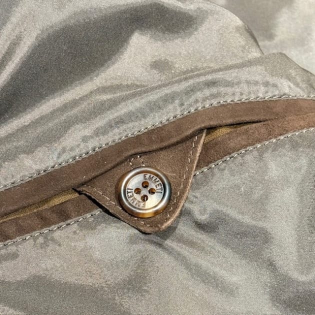 インナーの左右に配されたポケットにも表に使われているゴートスエードで縁取りが施され高級感が感じられます。またボタンには<EMME TI>のロゴが入っておりオリジナリティを感じることが出来ます。細部のディテールにまでこだわりが感じられ上質感を感じていただけると思います。