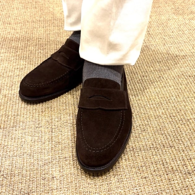 今回セール対象のドレスシューズはほとんどありませんでした。そのためこのシューズも対象品ではございません。<CROCKETT&JONES / クロケットアンドジョーンズ>の「MAINE / メイン」です。英国製のシューズでありながらアメリカのアイビースタイルをイメージさせられるフォルムです。そしてこのシューズは非常にきめ細やかなスエードが使用されています。そのスエードを独自技術のなめし製法によって、水や汚れに強いという特徴の併せ持っています。