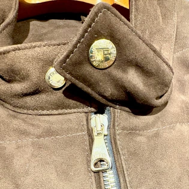 このスエードベストに使われているファスナーの引き手と襟のドットボタンは共に<EMME TI>のオリジナルパーツです。通常の既製品ファスナーをそのまま使うのではなく、ブランド専用のデザインはとても高級感が感じられます。同様にドットボタンにも<EMME TI>のロゴが刻印されています。通常でしたら見える側のボタン(オス)だけに刻印が刻まれるのが大半ですが<EMME TI>のドットボタンは留めると見えなくなる側(メス)にも刻印が刻まれているのはすごいと思います。