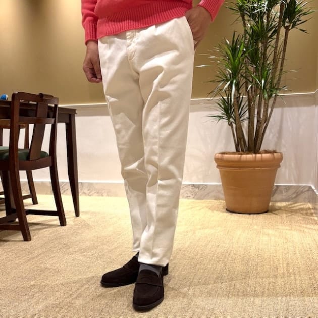 次はボトムスのご紹介です。こちらは今回のウインターセールでは対象外となっておりますので簡単にご紹介させていただきます。<BRIGLIA 1949 / ブリリア 1949>のコットンパンツです。見た目はドレスパンツのようですが、コットンにポリエステルを混紡したミックスファブリックが使われているので高いストレッチ性を持ちノーストレスでお履き頂けると思います。またプリーツが入っていることで腰回りに立体感が生まれそこから裾にかけてテーパードしていくラインはこのところのメンズドレスのトレンドシルエットだと言えます。