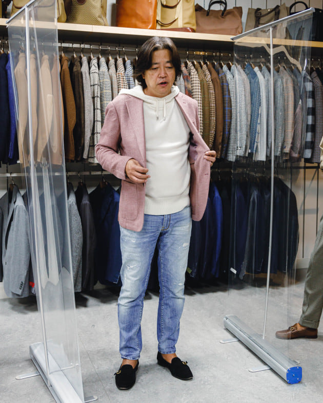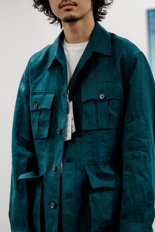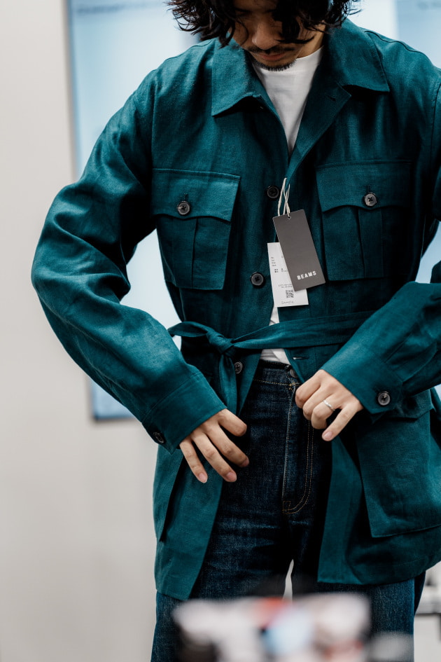 秋冬からパターンは変えていませんが、秋冬はウールやコーデュロイと言った厚みのある生地だったのに対して、春夏はリネン素材のため、サイジングにやや余裕を感じる方もいるかもしれません。秋冬モデルをお持ちの方は同じサイズと、ワンサイズ下の両方で試していただくと良さそうです。