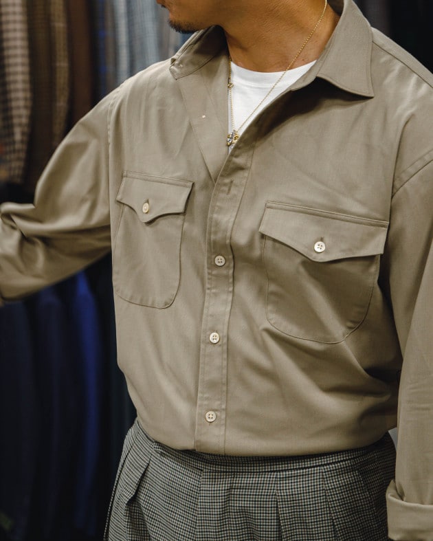 アメリカンワークの原型ともいえるスタンドカラーのカバーオールがベースとなっており、第一ボタン位置をやや V 気味に落としたバランスで抜け感をつくり、ヘンプ混による柔らかさも相まって、着慣れたワークジャケットのように肩肘張らずに羽織れる一着に仕上がっています。