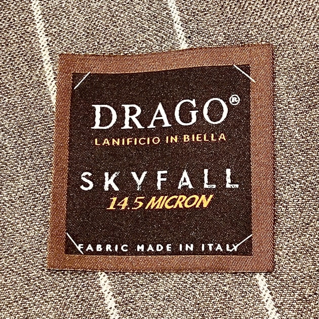 この服地はとてもコストパフォーマンスに優れています。「DRAGO / ドラゴ」社の「SKY FALL / スカイ フォール」です。織りネームにあるように14.5マイクロンというカシミアよりも細いスーパー180’Sの原毛を敢えて37番tん氏という太番手の糸を紡績することで、糸に膨らみと柔らかさを持たせた服地です。原毛を糸にする紡績から服地生産までを一貫しておきなっている「DRAGO」社だからこそ出来る最高級服地です。この服地はその「SKY FALL」の原毛にシルクとコットンをブレンドしたミックスファブリックです。とてもなめらかな手触りとソフトな質感が感じていただけると思います。
