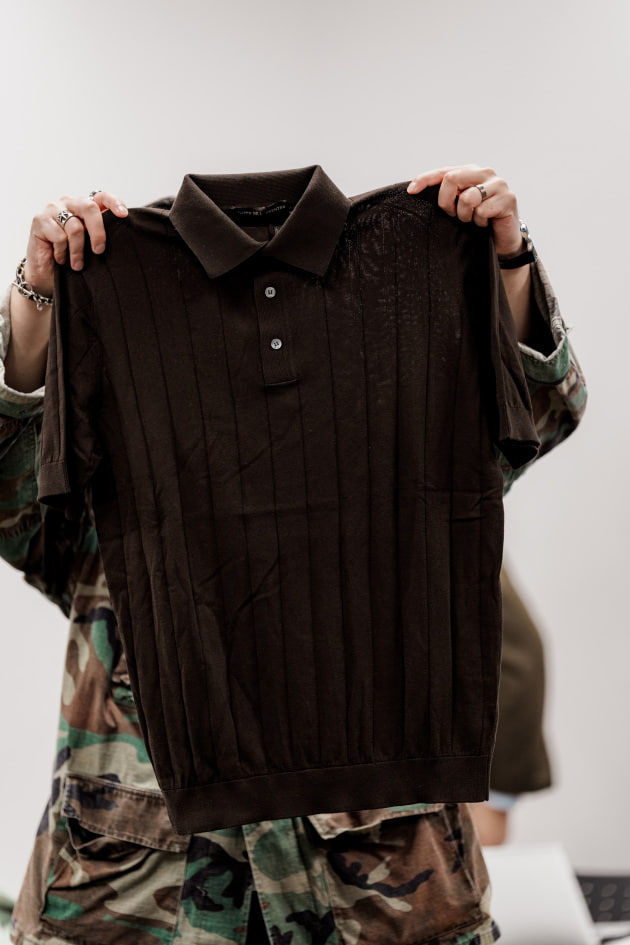 シャリ感のある強撚コットンを使用し、衿は台衿部分から成形して編立て縫製しております。