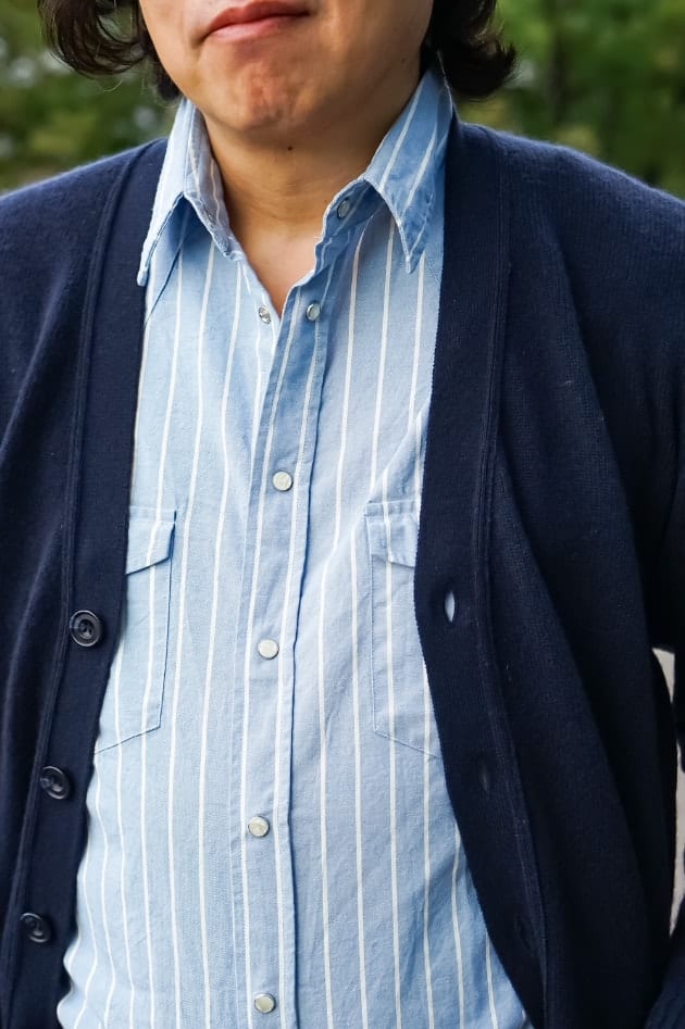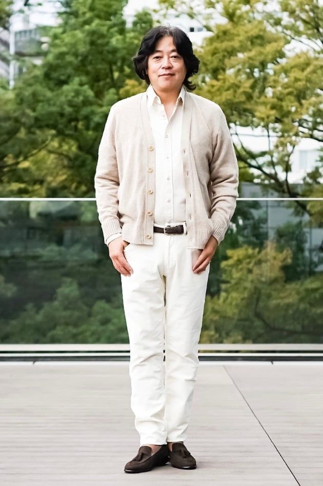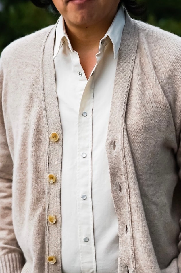 実はこのカーディガン、ご覧のようにフロントのボタンが無いんです。ニットジャケットのように軽く羽織る感覚で着て頂けるこのアイテムは<GRAN SASSO/グラン サッソ>の定番アイテムの「ボタンレス カーディガン」です。これからの季節、外はとても暑くなりますが室内に入ると寒いなんて言う事ありますよね。そんな時にこのニットが活躍してくれると思います。また、本日の私のコーディネートのように、避暑地で夜肌寒いなんていうときにも、とてもカッコよくて大人っぽい雰囲気が出ると思います。