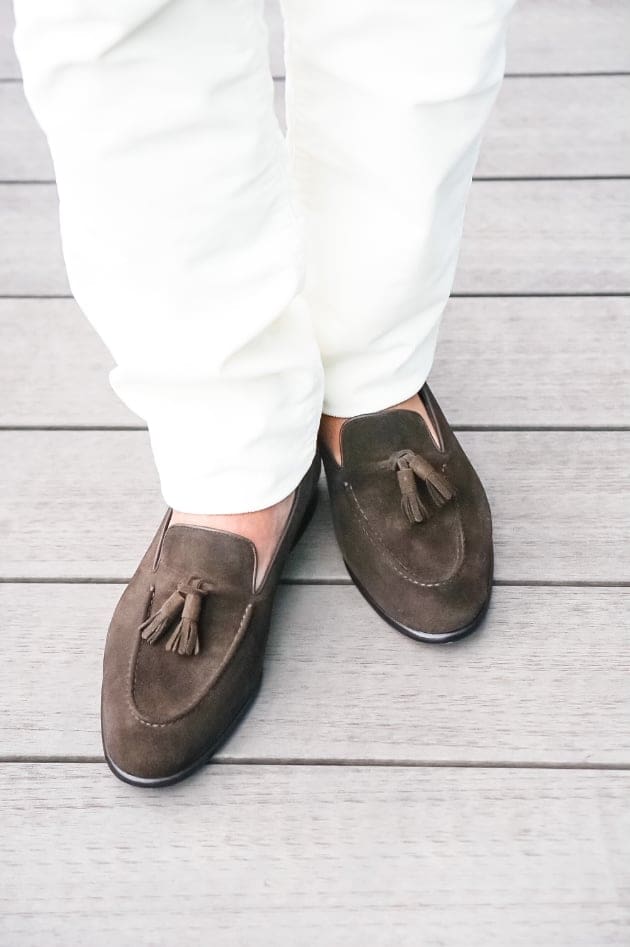 シアサッカーにはホワイトシューズが似合うという事で<PARABOOT/パラブーツ>のベストセラーモデルであるデッキシューズの「BARTH/バース」をコーディネートしてみました。このBARTH表面のレザーにシボがあるのがお判りいただけると思いますが、鹿革を使っているタイプなんです。そのため着心地がとても柔らかく素足でお履き頂くと足に吸い付くような感覚です。そして鹿革なのでとても軽いという特徴を持っています。