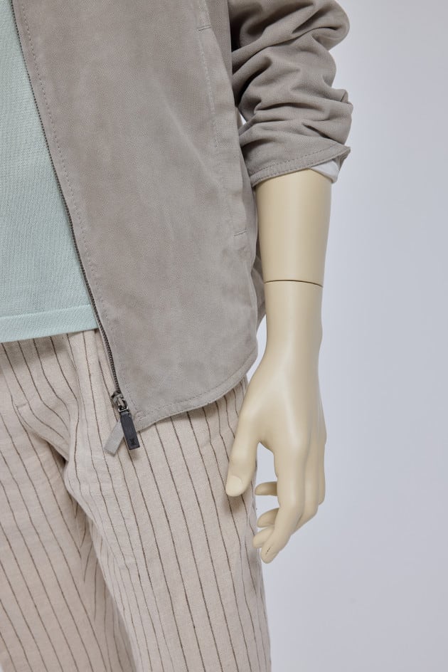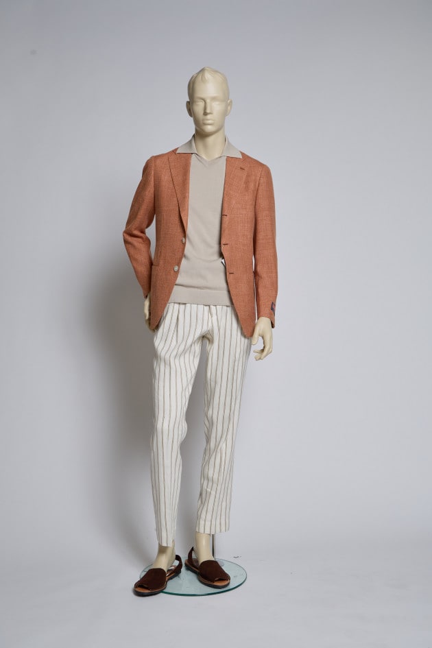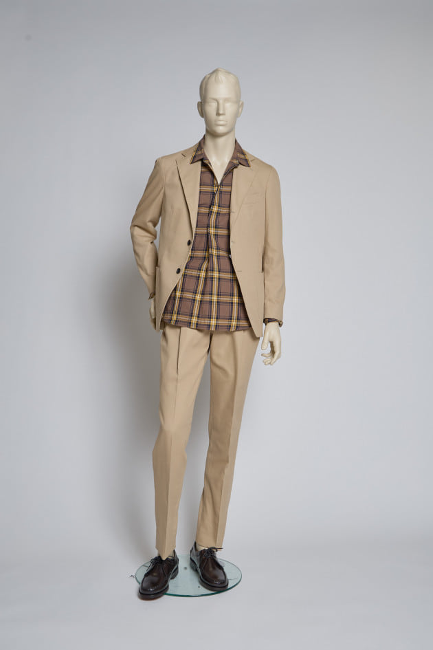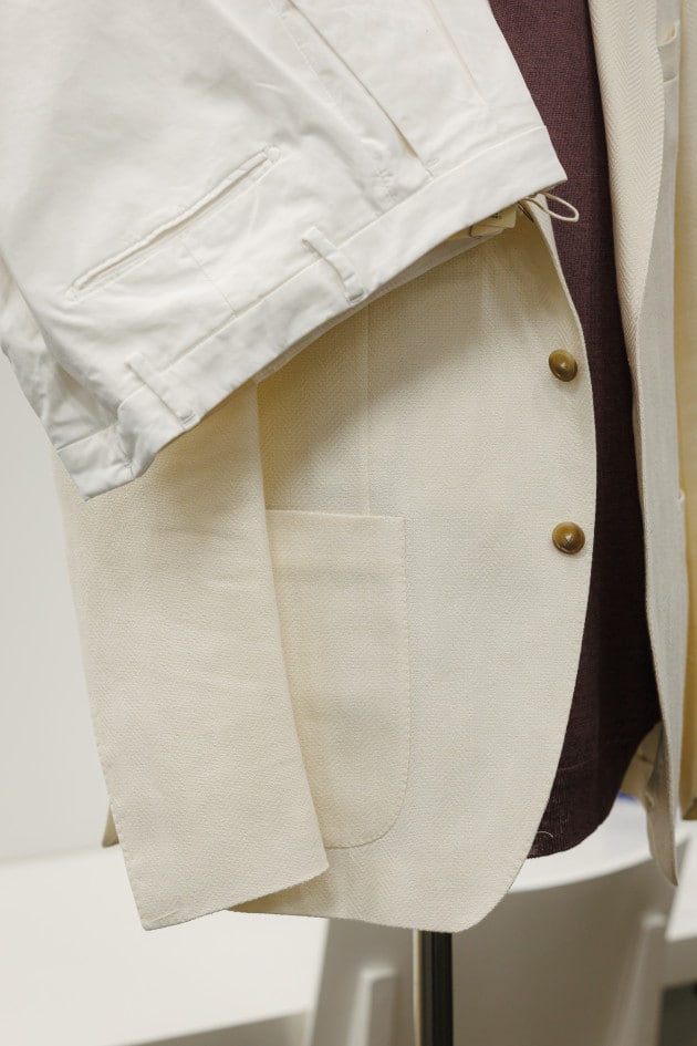 「一枚仕立てのジャケットは、シャツ感覚で羽織れるほどの軽い質感。それでいて端正な雰囲気も感じられ、まさにジャケットとシャツの良いとこ取りの一着と言える仕上がりです。ウォッシャブルウールを使用しており、その使い勝手の良さも抜群。モダンでハイブリッドなセットアップです」