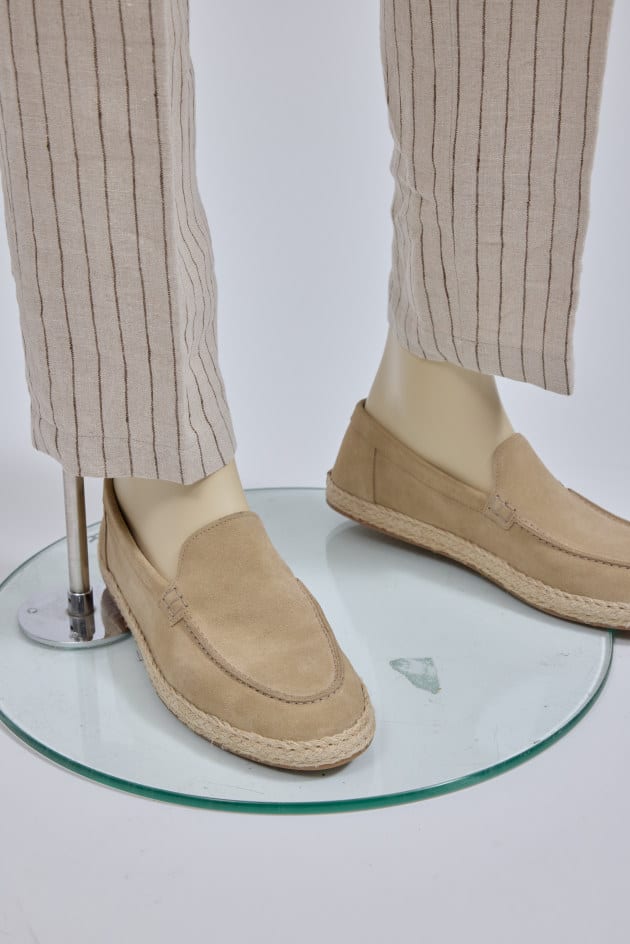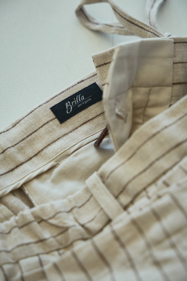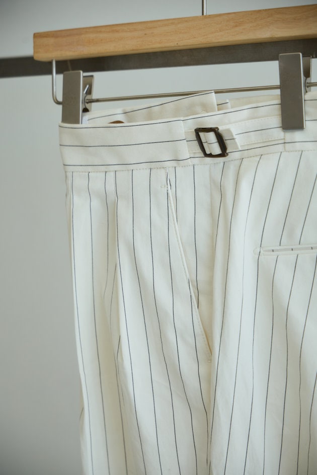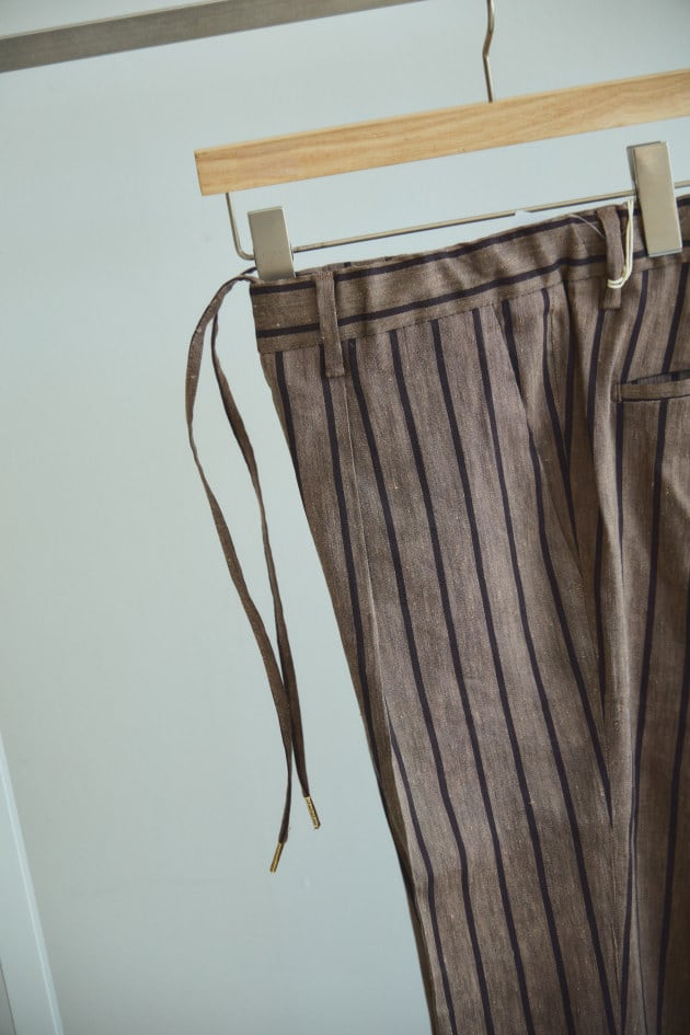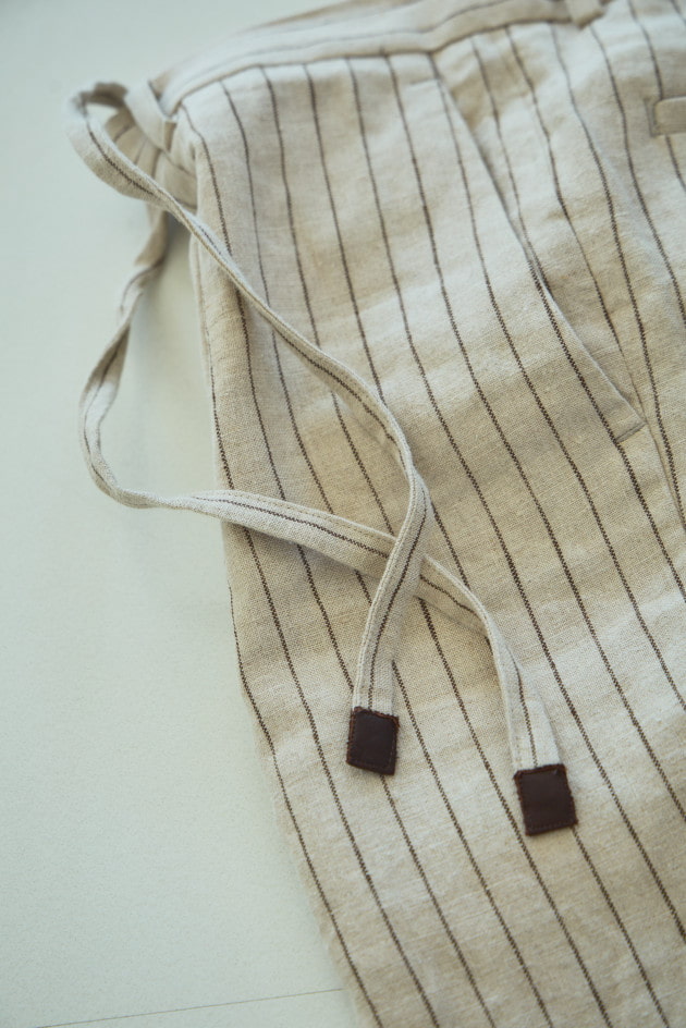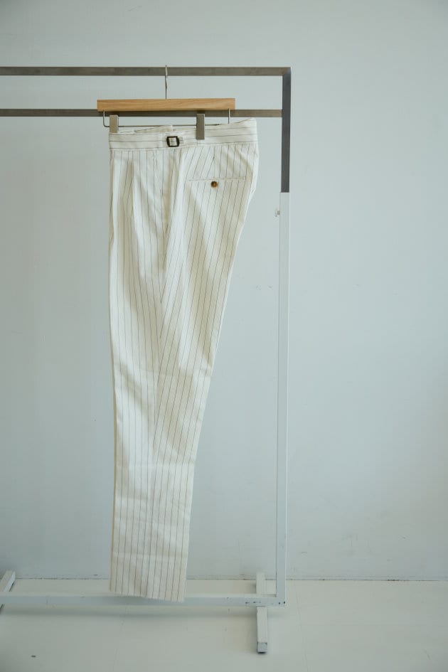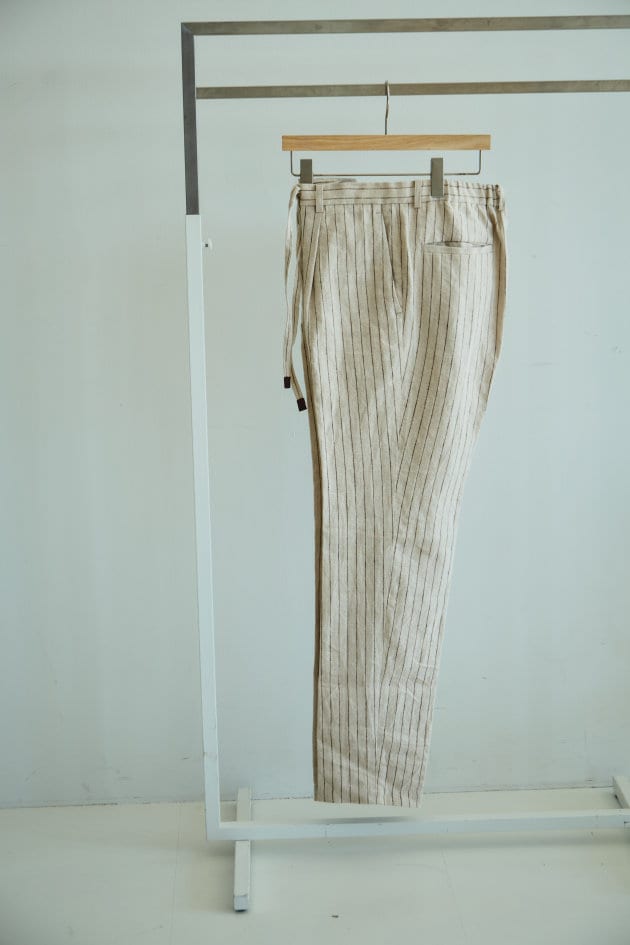 「インでもアウトでも着用できる、リラクシーでいてやりすぎない上品さを残したほどよいバランスのサイジング。〈ALBINI〉のリネンを使用し、綺麗な発色のノリもポイントです。こちらのインディゴにホワイトでのカラー展開です」