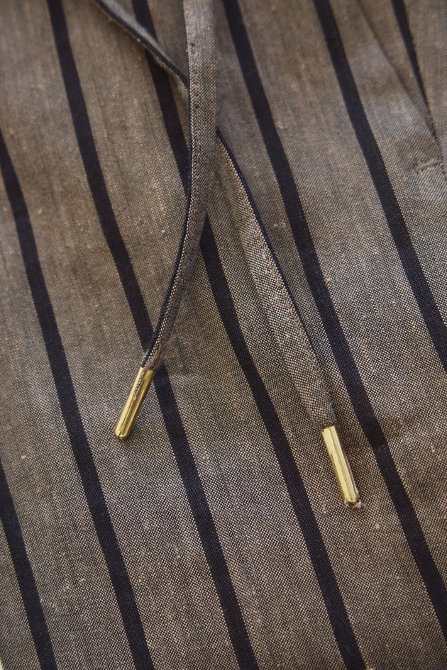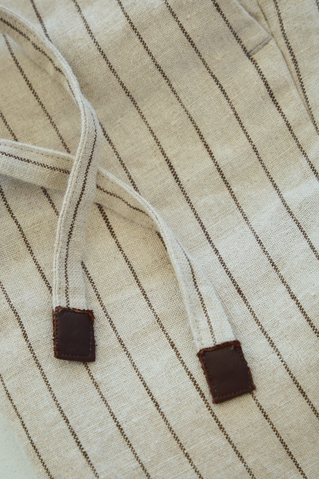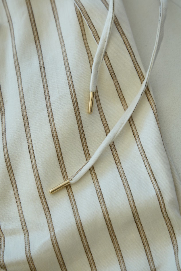 「シンプルなカプリシャツにほどよくスパイスが効いた、抜け感あるデザインがこなれています。ゆったりとしたシルエットで、ドローコードのパンツやショーツとの相性は抜群。ブラウンのソリッドにナチュラルベースのサンドストライプで展開します」