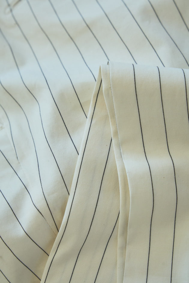 「今回のこの企画は”80、90年代にあったようなリゾートテイスト”をイメージして企画しており、このマルチストライプもその一つ。当時アメリカブランドを始め、さまざまなブランドがこぞって展開していました。その雰囲気を再現しつつ、今の時代性に合わせて作り上げたのがこのシャツです。一見派手なマルチストライプですが、着てみると意外にもしっくりと馴染んでくれ、シンプルな春夏の装いの良いアクセントとなります」