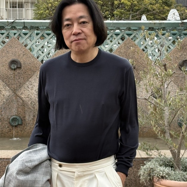 テーラードジャケットにクルーネックのTシャツを合わせる場合には、コットン素材のものをお選びになるとカジュアル感が強く出ますが、今回、私が選んだのは<Brilla per il gusuto / ブリッラ ペル イル グスト>オリジナルのシルク100%のニットTシャツです。このTシャツを選んだのはテーラードジャケットと2インプリーツパンツから醸し出されるドレッシーで高級感のある雰囲気をより強調させるためです。画像では色目が黒に見えるかもしれませんが濃いネイビーです。そして、シルク繊維は非常に細くしなやかなため、身体のラインに沿って美しく流れるようなシルエットが出ます。画像のウエスト周りの自然な「たわみ」は、シルク100%ならではの上質感のある着用ジワです。