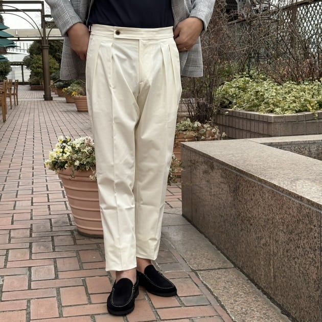 今回の2インプリーツパンツは<BERWICH / ベルウィッチ>のベストセラーモデル「SCOTCH / スコッチ」です。ご覧のようにこのパンツの見た目の最大の特徴はフロントの深い2プリーツです。この腰回りのボリューム感がインナーのニットをインしたときに出るゆったりとしたラインがクラシックな印象をもたらしてくれます。また、「キャロットシルエット」と言われるゆったりとした腰回りから膝幅と裾幅にかけて一気に絞り込まれた強めのテーパードもこのパンツの特徴の一つです。