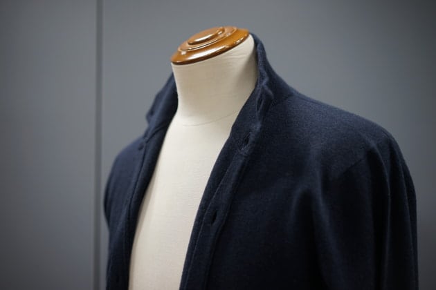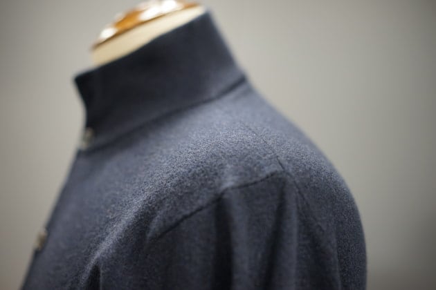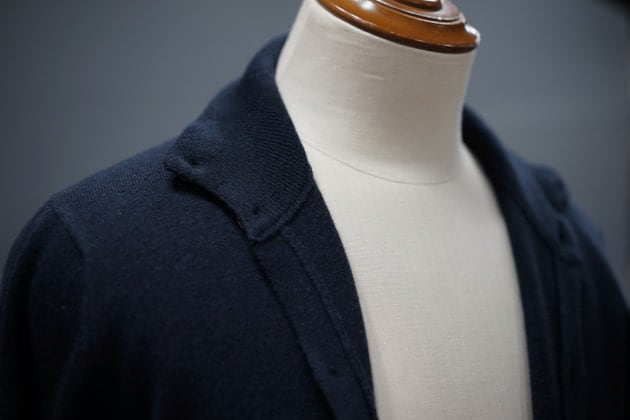 素材にはウールにカシミヤを10%ブレンドした12ゲージニットを使用。