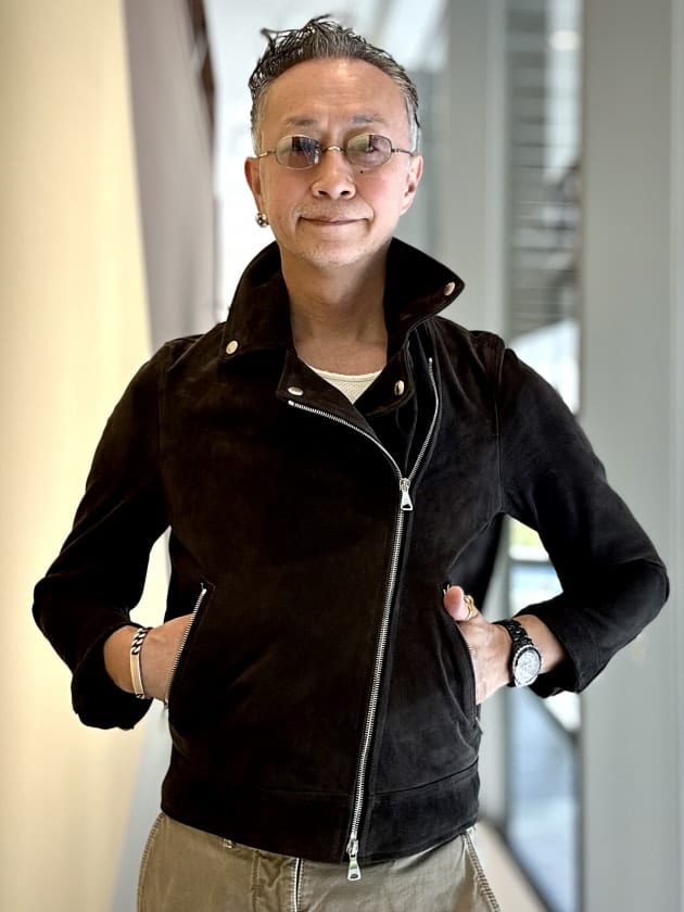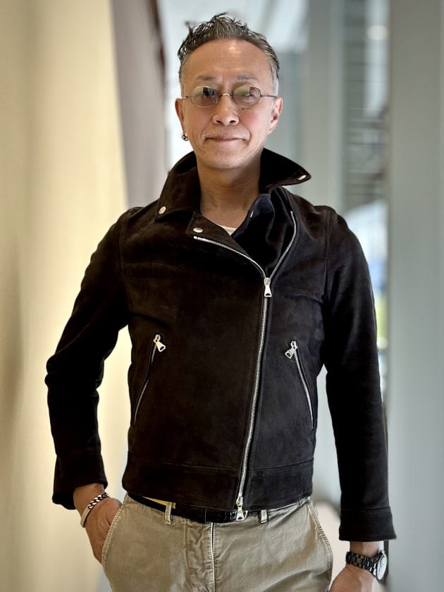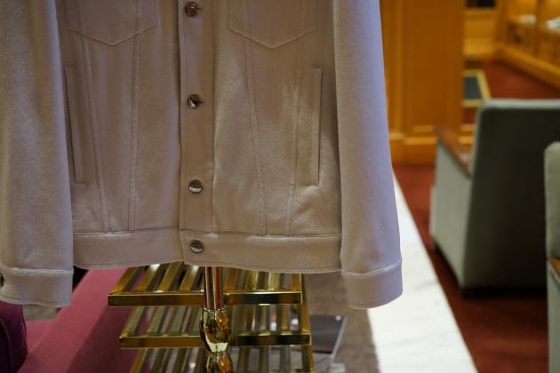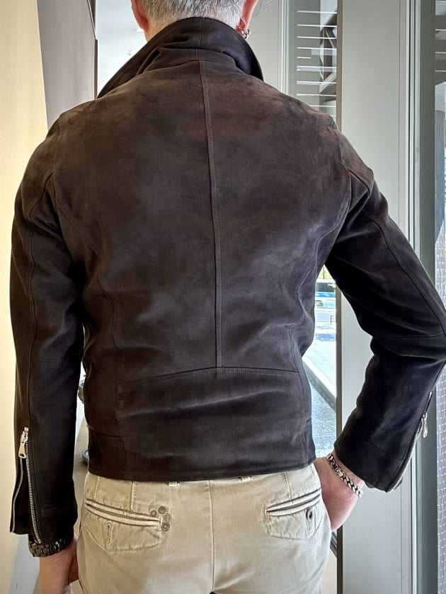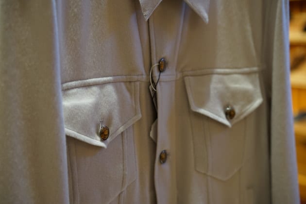 定番モデル『JURI』を着丈を5㎝長く袖丈を2㎝短く設定したエクスクルーシブモデル『JURI BEAMS3』。ライトグレーの非常にしなやかな山羊革スエードを使用しております。こんな洒落た色見たことありません。