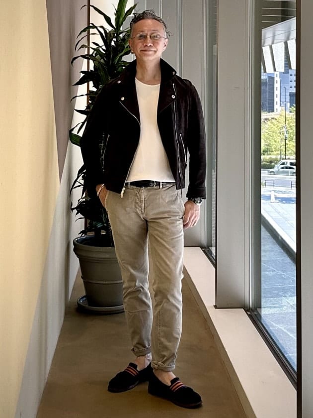 シューズはブラウンカーフのコインローファー、ベルトはダブルリングのスウェードベルトで如何でしょう。