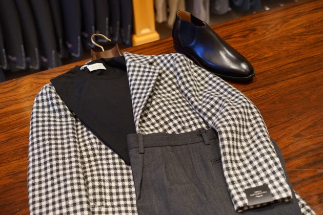 近寄って見るとグレンプレイドに僅かにグリーン?(ブラウン?)のペーンが洒落ています。モノトーンのチェックかと思いきや、新たに色が加わると立体的な表情となり、コーディネートの幅がグッと広がりますね。