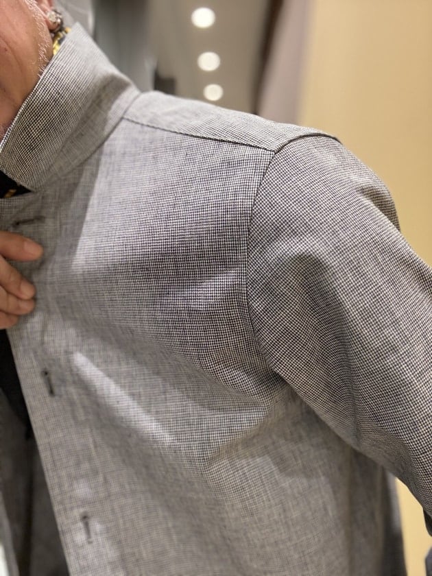 見頃と袖の長さを見直し、肩と袖の重なりも変更し、伴い袖付けも変更したエクスクルーシブ。