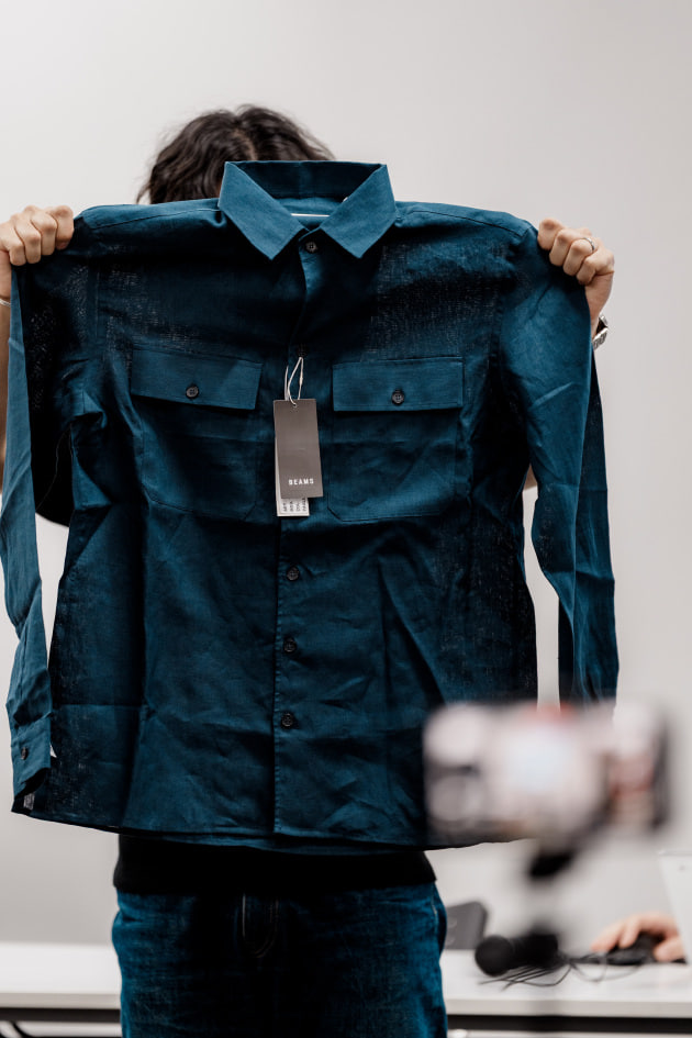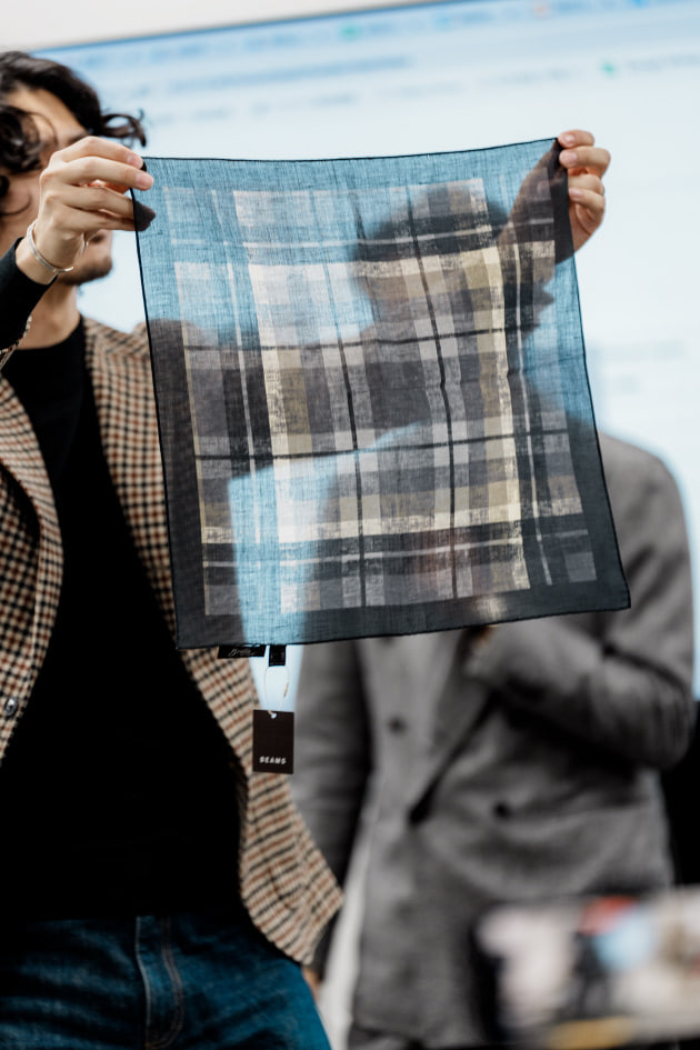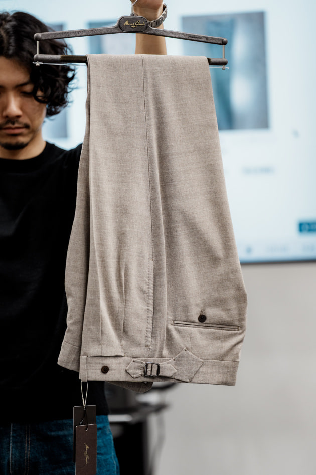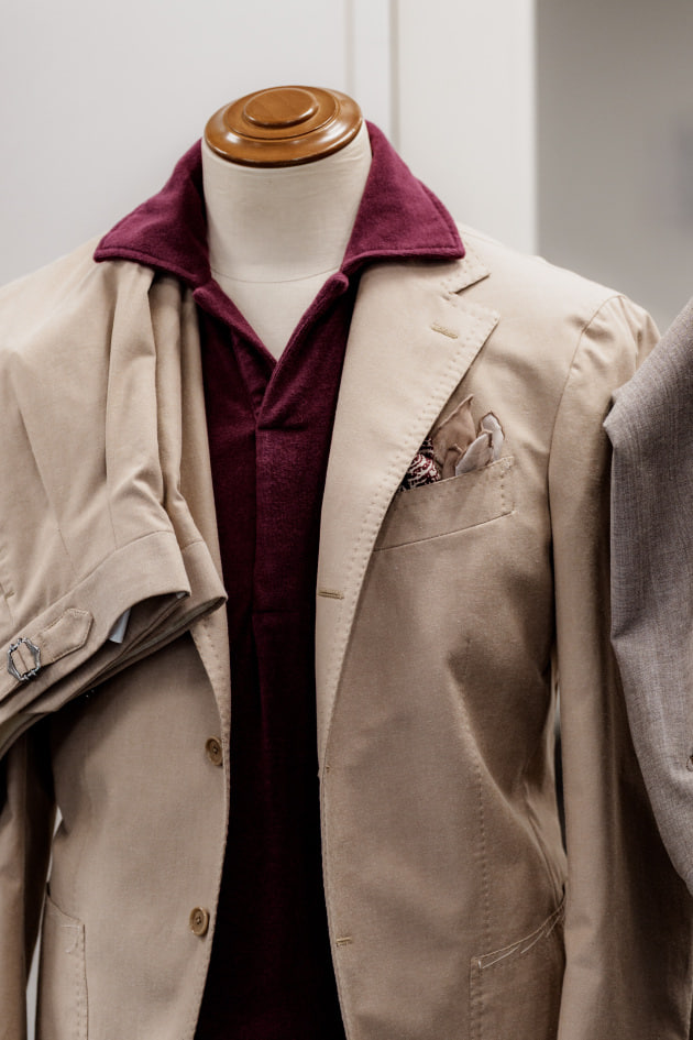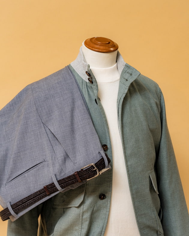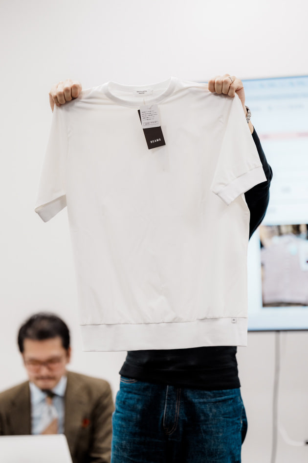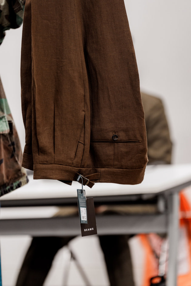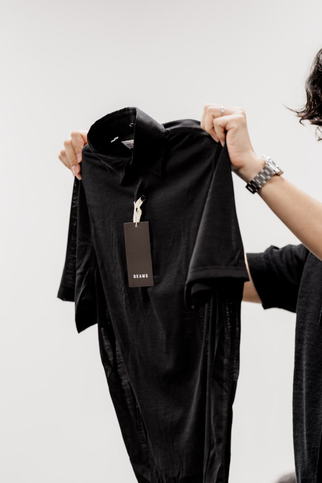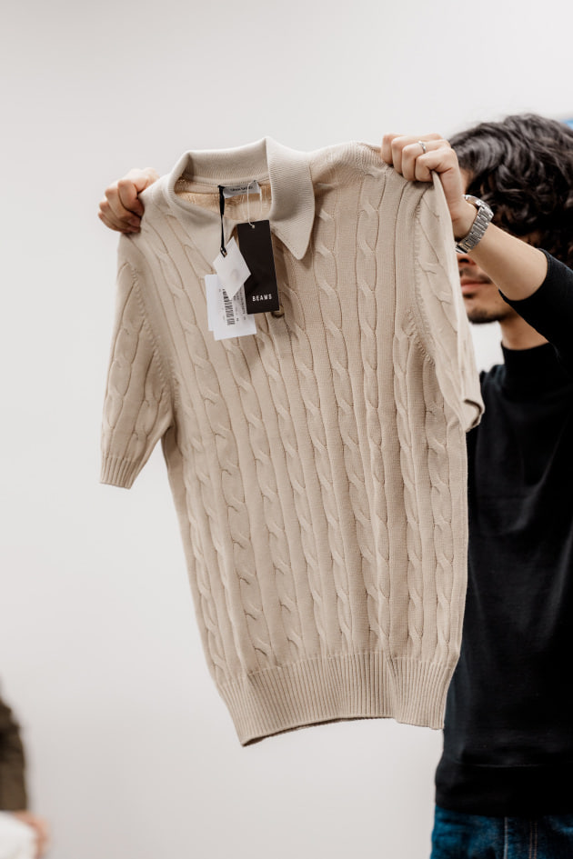 こちらも今回はサンプルなしですが、襟型(ワイドカラー)とボディフロント、カフスデザインの組み合わせを別注したBEAMSエクスクルーシブ仕様を今シーズンもご用意。既存の襟型とボディをベースにしながら、ボディ寸法にわずかなゆとりを持たせることで、スリムすぎない、今の気分に合ったバランスに仕上げています。ナポリシャツらしい色気はそのままに、より自然体で着られる一着です。
