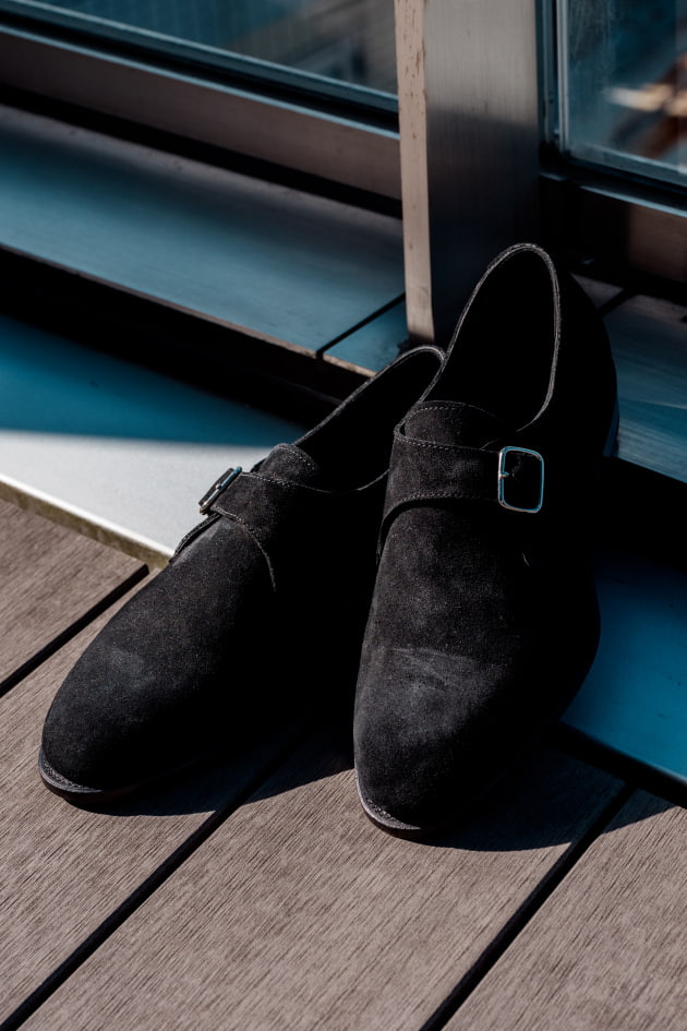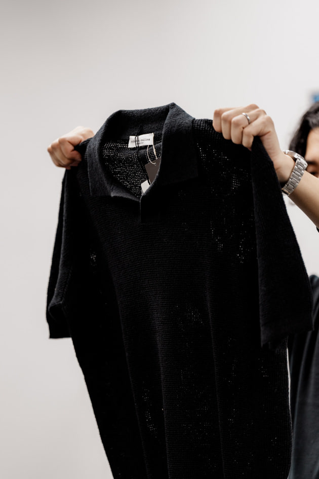 <GUY ROVER>の定番ポロをウール素材で展開。何度か書いてますが、実はコットン100%よりも夏場快適なウール素材。ビジネス対応を意識し、ネイビーとブラックをセレクトしています。かなりタイトなフィッティングだったため、別注でボディを緩めに変更しております。