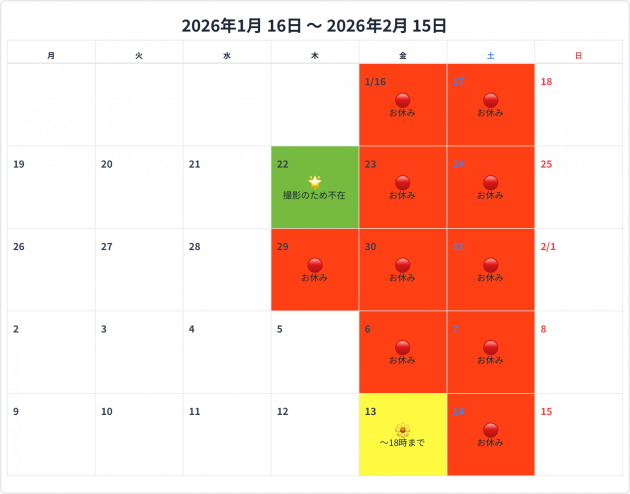 月毎にこういう出勤スケジュールも作成しておりますのでご来店、お問い合わせの際にお役立てください。