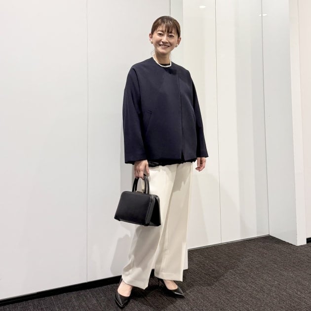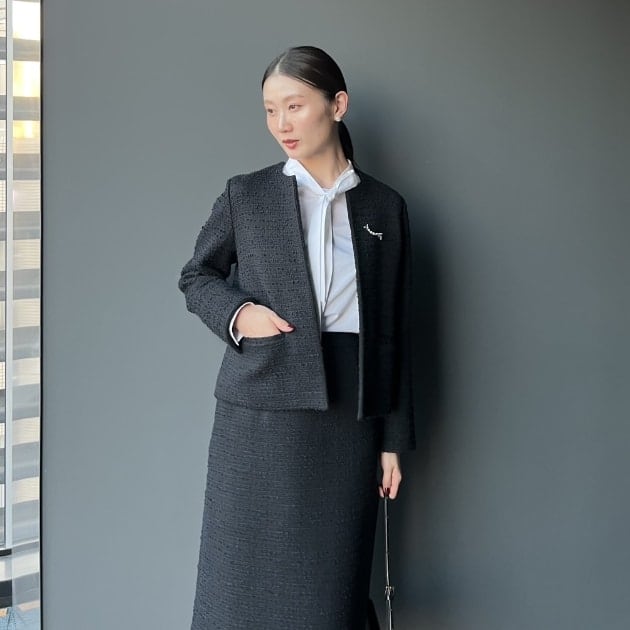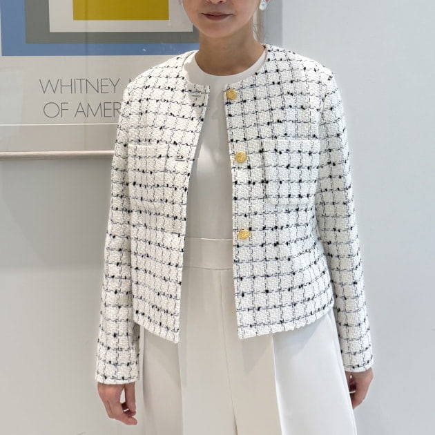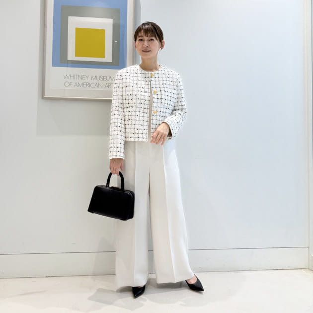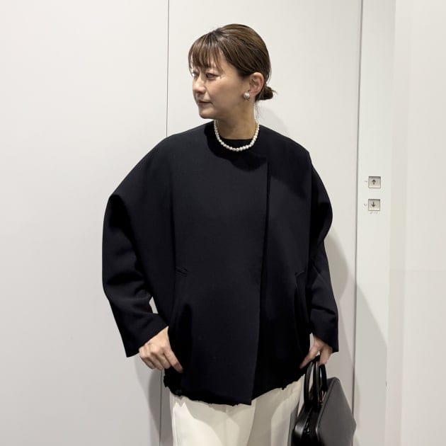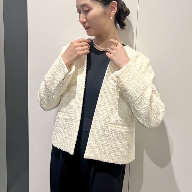 ジャケットはノーカラータイプ。長すぎない着丈は様々な身長の方にもフィットしやすく、ワンピースやワイドパンツとも好相性です。