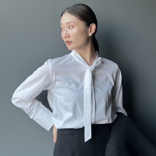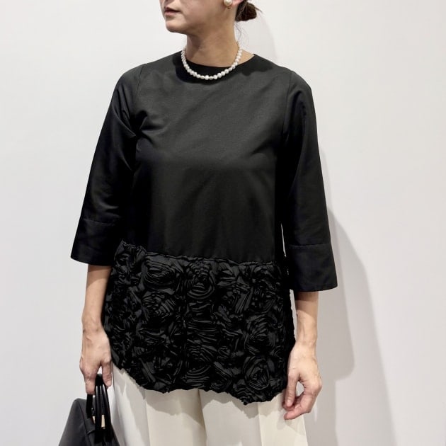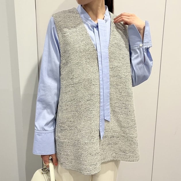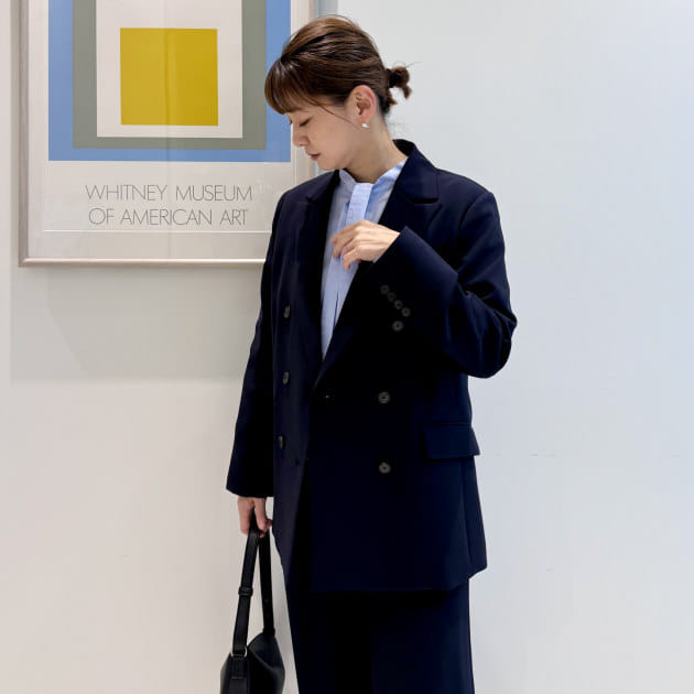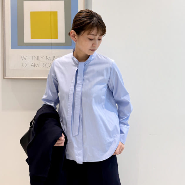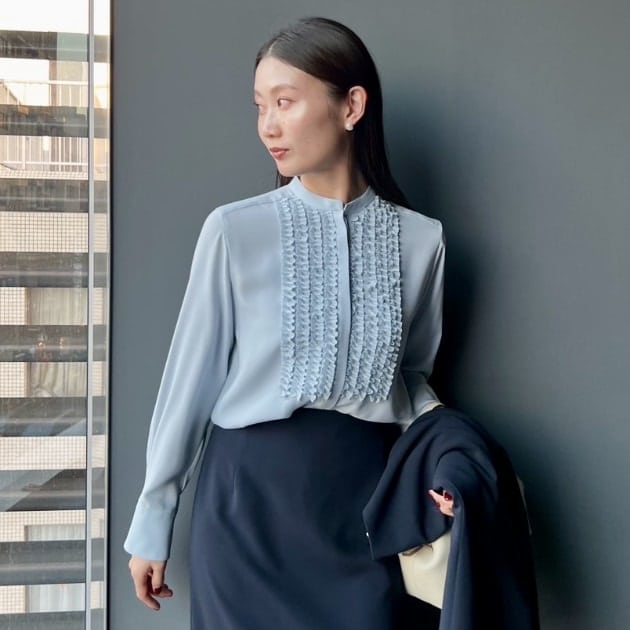 インナーはフロントフリルの華やかなブラウス。ジャケットが滑らかに羽織れる素材感と袖のデザインです。特別感のあるブラウスは1枚あると重宝しますよ。