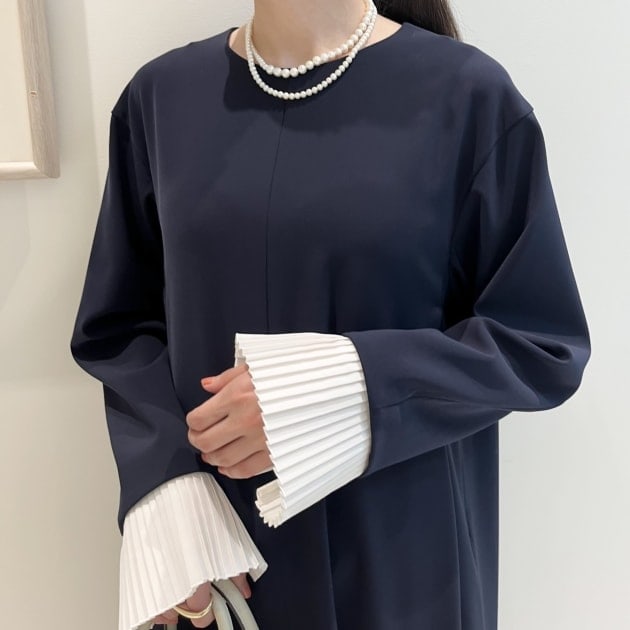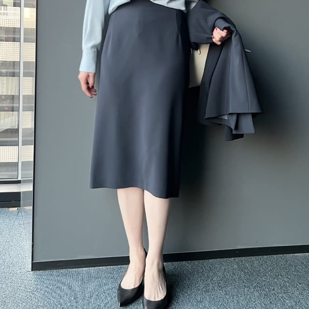 着丈は座っても膝が見えすぎない長さに仕上げられ、上品な丈感。